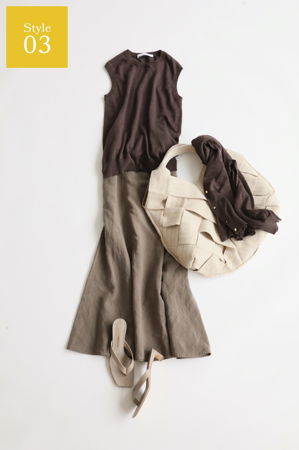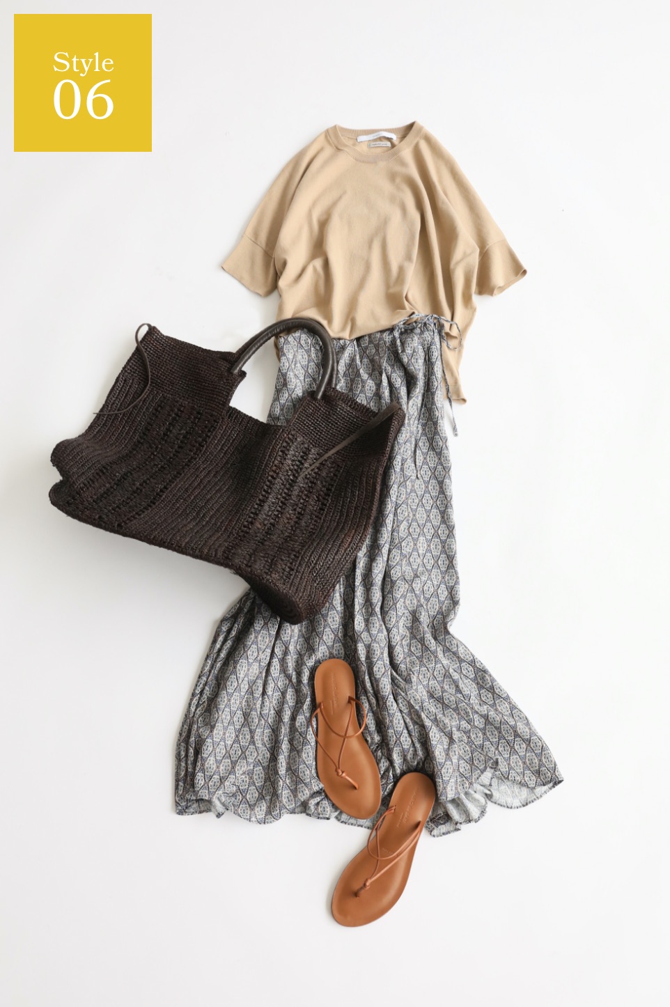 スカートの魅力を引き立てる、上品なブラウンのワントーンです。麻のスカートってほっこり甘くなりがちなんですが、これは動くたびに揺れるマーメイドのようなシルエットが、とてもきれいで大人っぽい。Tシャツやスニーカーとでも、カジュアルになりすぎる心配がないのもうれしいですね。リネンのアンサンブルニットでエレガントに装うときは、ビッグサイズのバッグなどで、あえてバランスを崩すのがコツ。- FRAMeWORKリネン天竺アンサンブル◆¥23,100(税込)