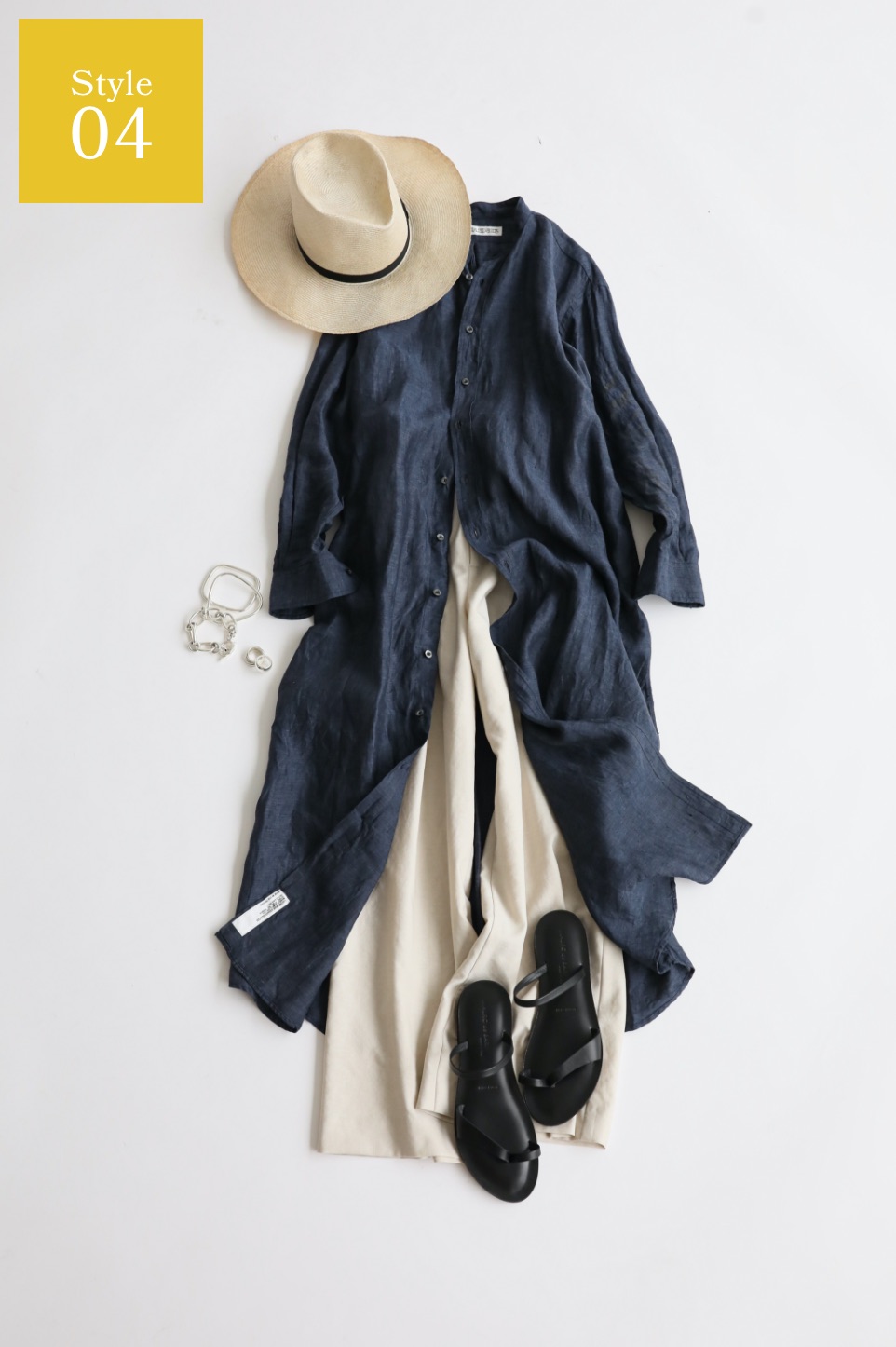 着回しがきくアイボリーのパンツに、ネイビーのシャツワンピを重ね、ハットや大ぶりのシルバーアクセでクールに味付け。ちょっぴりマニッシュなイメージでまとめてみました。少しとろみのある素材で仕立てたウエスト高めのセミワイドパンツは、ぺたんこ靴ともバランス良好なうえ、コーデ次第で通勤もカジュアルもOK。しかも家で洗えて、ウエストはゴム+ドローコード。デイリーユースに最適です。- FRAMeWORK【INDIVIDUALIZED SHIRTS】 W-POCKETロングシャツワンピース◆¥39,600(税込)