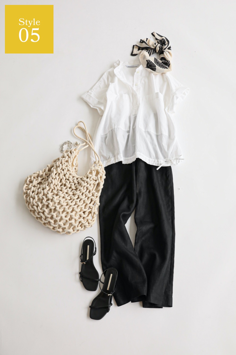 バンドカラーや大きなポケット、ゆったりとした形、洗いざらしで着たいハリのあるコットンの素材感など、今年っぽさがぎゅっと詰まったブラウスです。裾の左サイドで結ぶドローコードや前ボタンの開閉で、気軽にシルエットや印象をアレンジできるデザインも高ポイント。リラックス感が漂う黒のリネンパンツを合わせたシンプルなコーデに、スカーフやメッシュバッグでさりげない遊びを添えて。- FRAMeWORKシアサッカードロストシャツ◆¥16,500(税込)