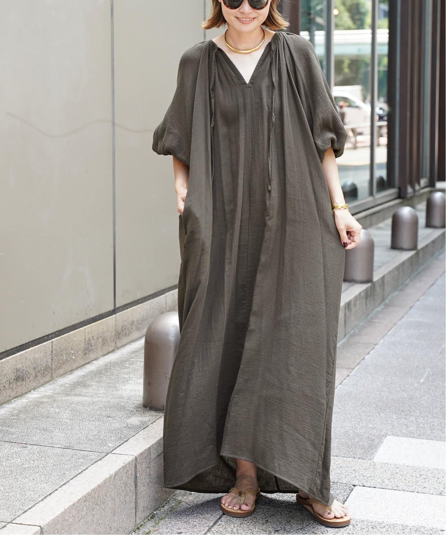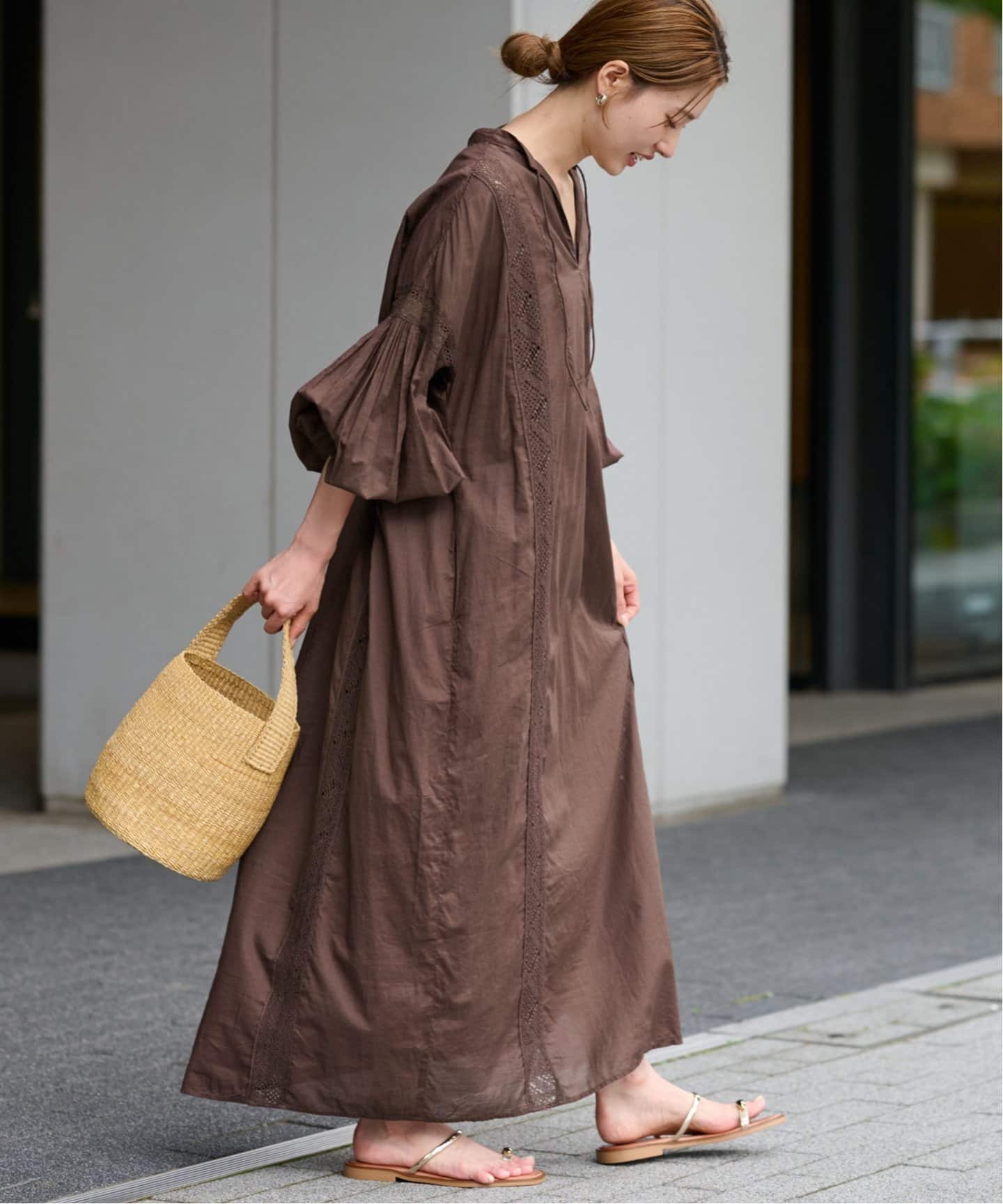 茶系がおすすめふんわりと風をはらむデザインが心地よく華やかなワンピースは、ベージュやブラウン、カーキといったシックな秋色を狙って。FRAMeWORKファインボイルシームレースカフタンワンピースのように、刺繍レースを甘すぎずに大人っぽく楽しめる効果も。