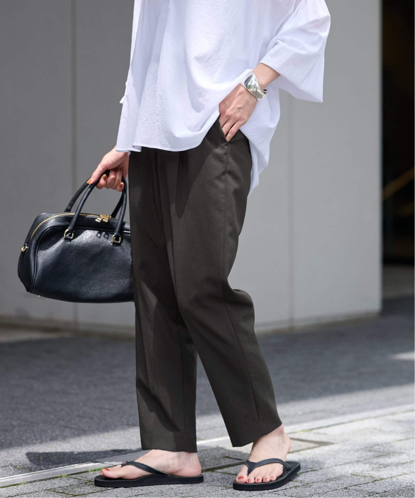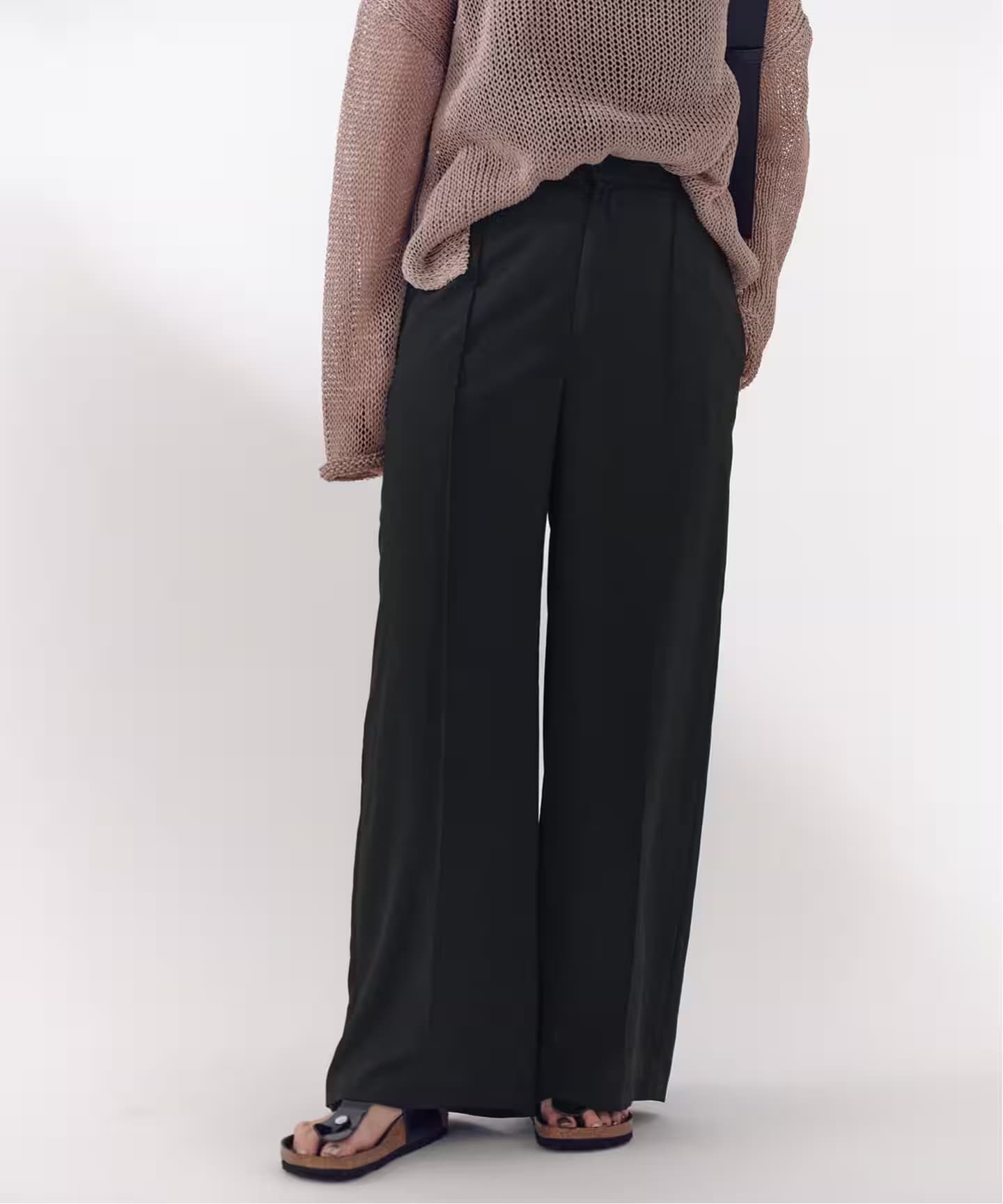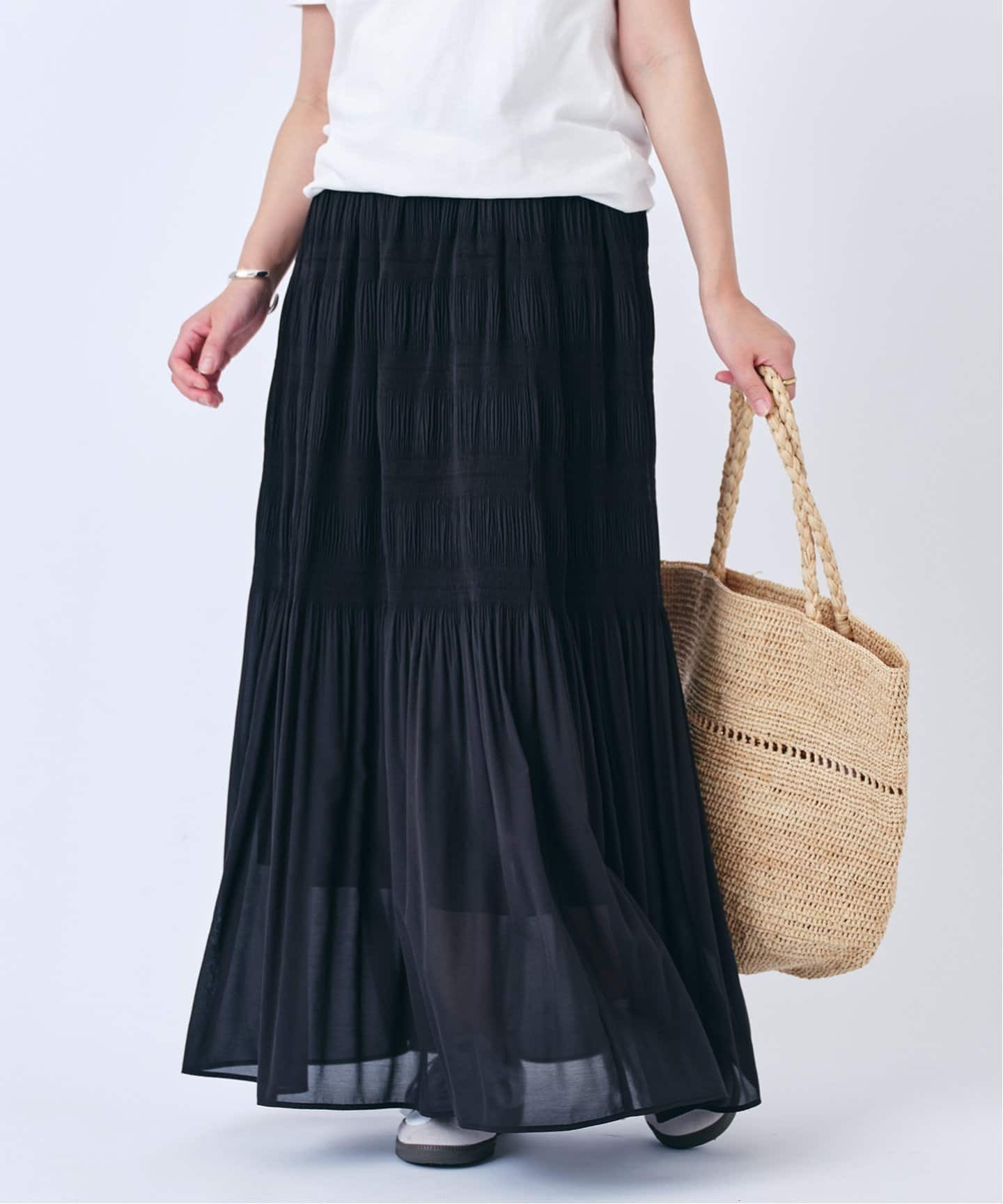 キレイめボトムスをブラックでJOURNAL STANDARDのマンスローンプリーツスカートは程よいシアー素材に繊細なプリーツをプラスし、軽快に揺れるマキシスカート。FRAMeWORKはストレスフリーな履き心地で急な雨にも安心な撥水リサイクルPeイージーパンツ。