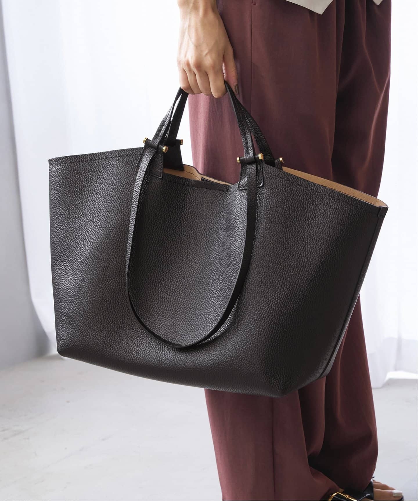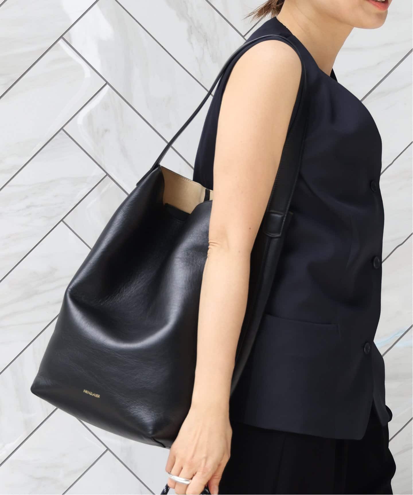 キレイめビッグトートが通勤のお供デイリーに使うお仕事バッグは大容量のトートが安心。Plageが&MyuQに別注したMATTE ERA バッグは、モードな台形フォルムの上品なルックス。ハンドル部分を通常より長めにすることで、より肩にかけやすく気を配ったスペシャルデザイン。