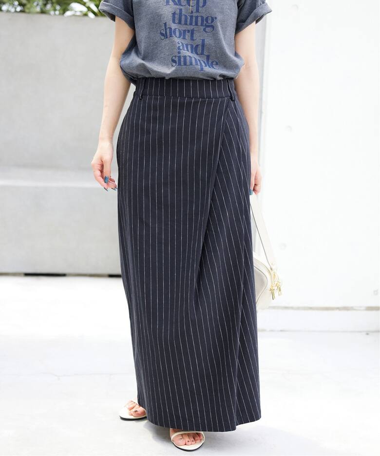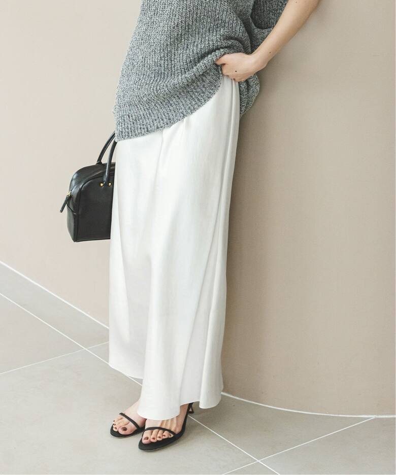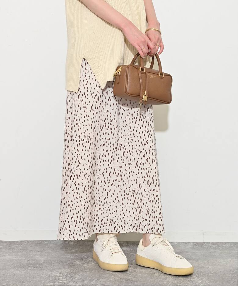 柄スカートがデイリーに使えるSLOBE IENAのリネン混タック Iラインスカートは、端正なピンストライプのスッキリした縦長シルエットにアシンメトリーなデザインをプラス。レオパードドットスカートは、派手見えしない小ぶりのレオパードがトライしやすい。