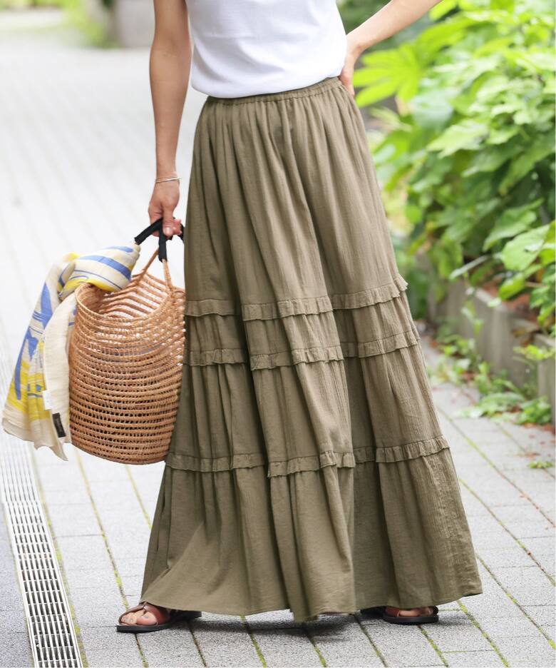 秋カラーで堪能残暑のシーズンも涼しい着心地で秋っぽさを演出できる、ダークカラーのティアードスカートが豊作。La Totaliteシアーティアードスカートはアシンメトリーにあしらったティアードデザインや微光沢のシアー、ニュアンシーなくすみカラーが女っぽくこなれた一枚。