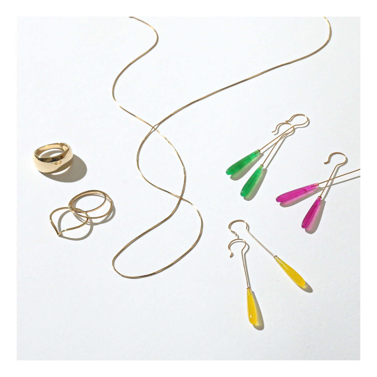 センシュアルな女性らしさがトレンドの今シーズン、ジュエリーも透明感とバランスが新定番に。自分らしさを大切にしながら、知性や気品を感じさせるLilasのSSコレクション。耳元に印象的に揺れるカラーピアスは、夏コーデに映えるポップな色合いが魅力。ネックレスやリングはシンプルなものを重ね付けして。