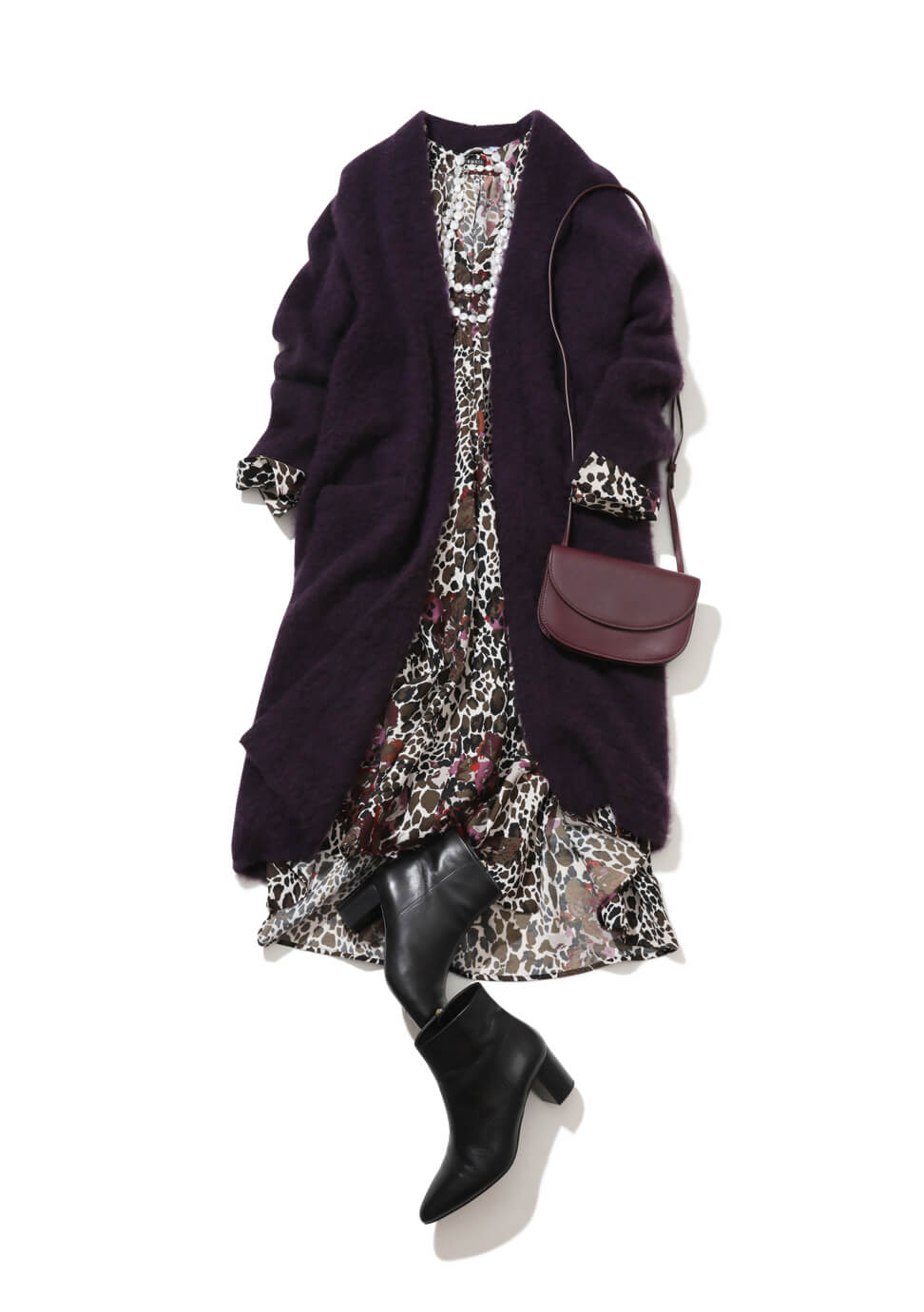 ワンピース×ニットガウンという定番の組み合わせも、柄や素材に気を配ればリュクスな艶がキラリ。夜のお出かけにも映える、フラワーレオパードのワンピースはすっきり開いたVネックラインが大人の抜け感も。ラフに羽織ったニットガウンは、カシミヤの上質感とパープルの色気がふんだんに漂う“魅せアウター”。足元は黒ブーツでシックにまとめて。