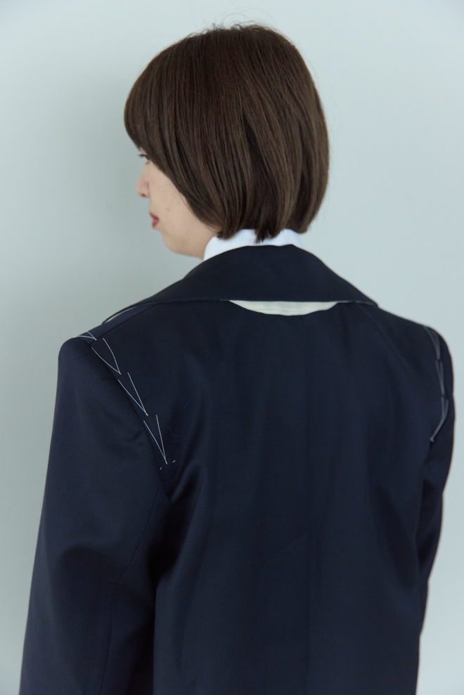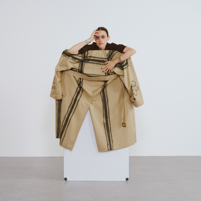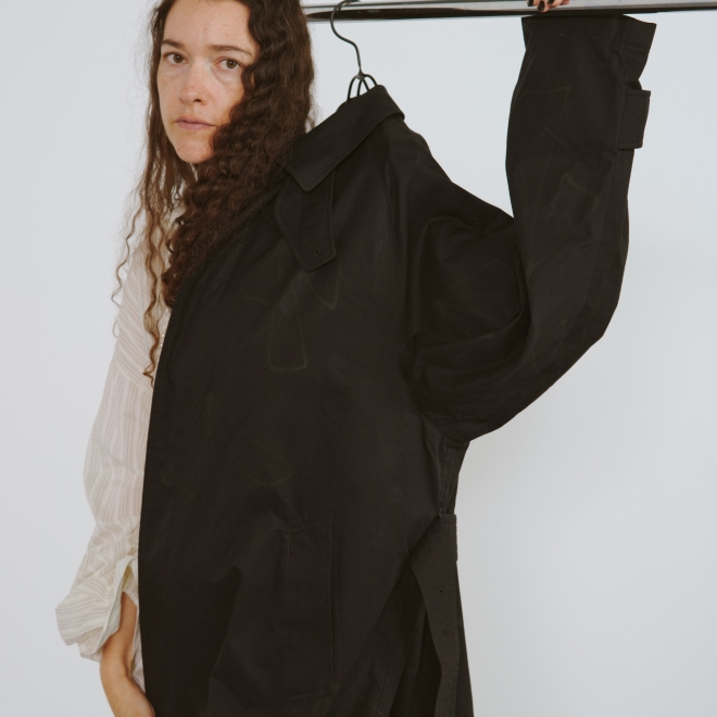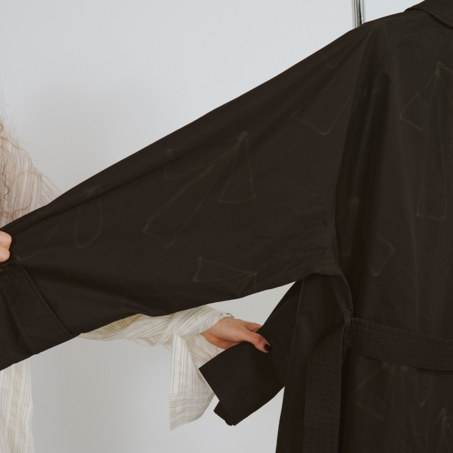 メンズカテゴリーの定番モデルとして親しまれている『FILEY』を原型に、伝統に敬意を表しながらあえてワンウォッシュすることでカジュアルな表情を演出。パターンは、女性が着用した際に抜け感を演出できるよう、こだわりのビッグシルエットへとアレンジが加えられています。襟ぐりが定番型よりも抜けて、袖下も深く、たっぷりとした袖幅が実現可能となりました。さらに、裾は切りっぱなしでラフに仕上げることで、大人の女性が品良く纏えるバランスに。従来のステンカラーモデルには付属しないチンストラップも加えられているので、襟を立ててハンサムに纏うことも。