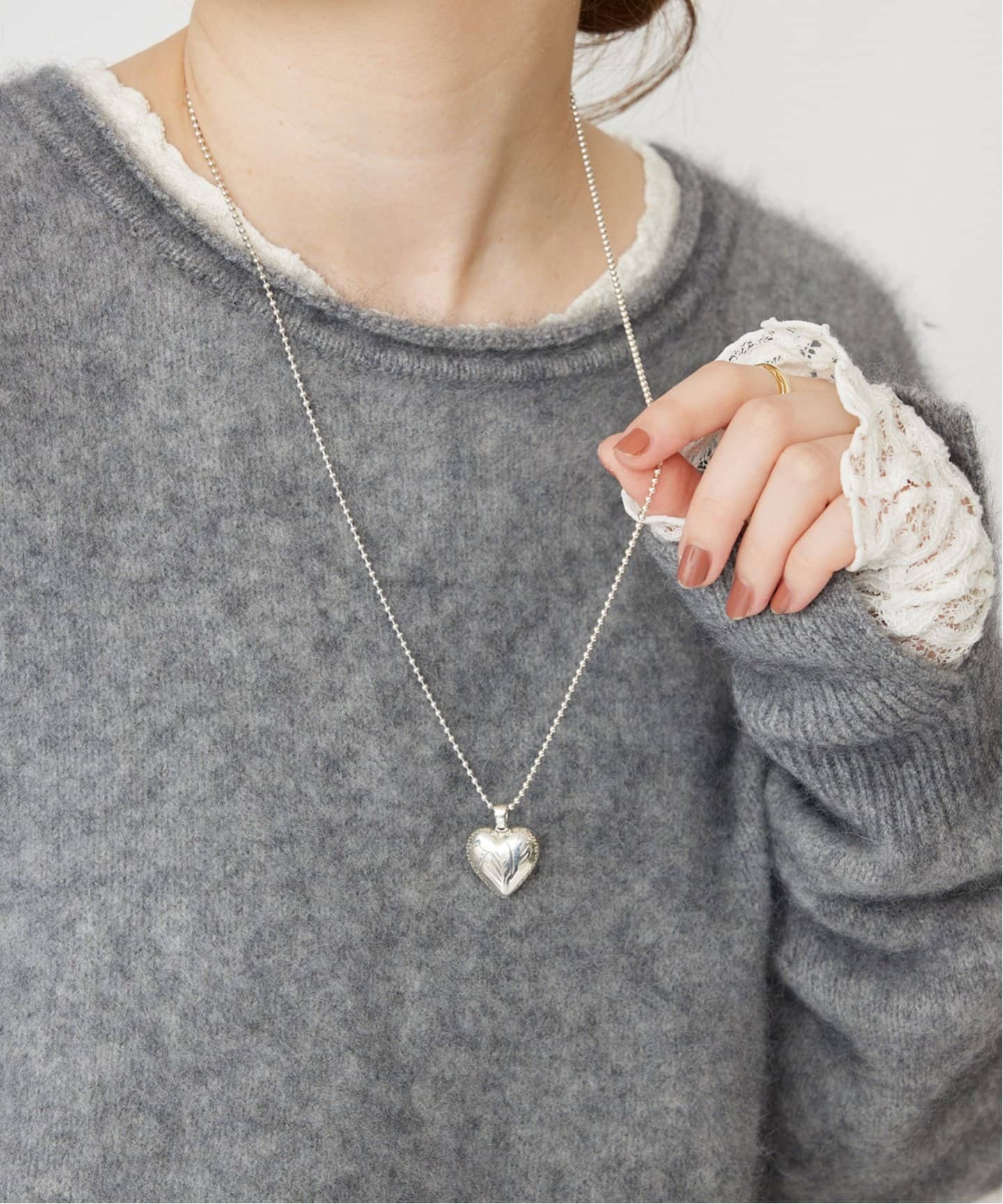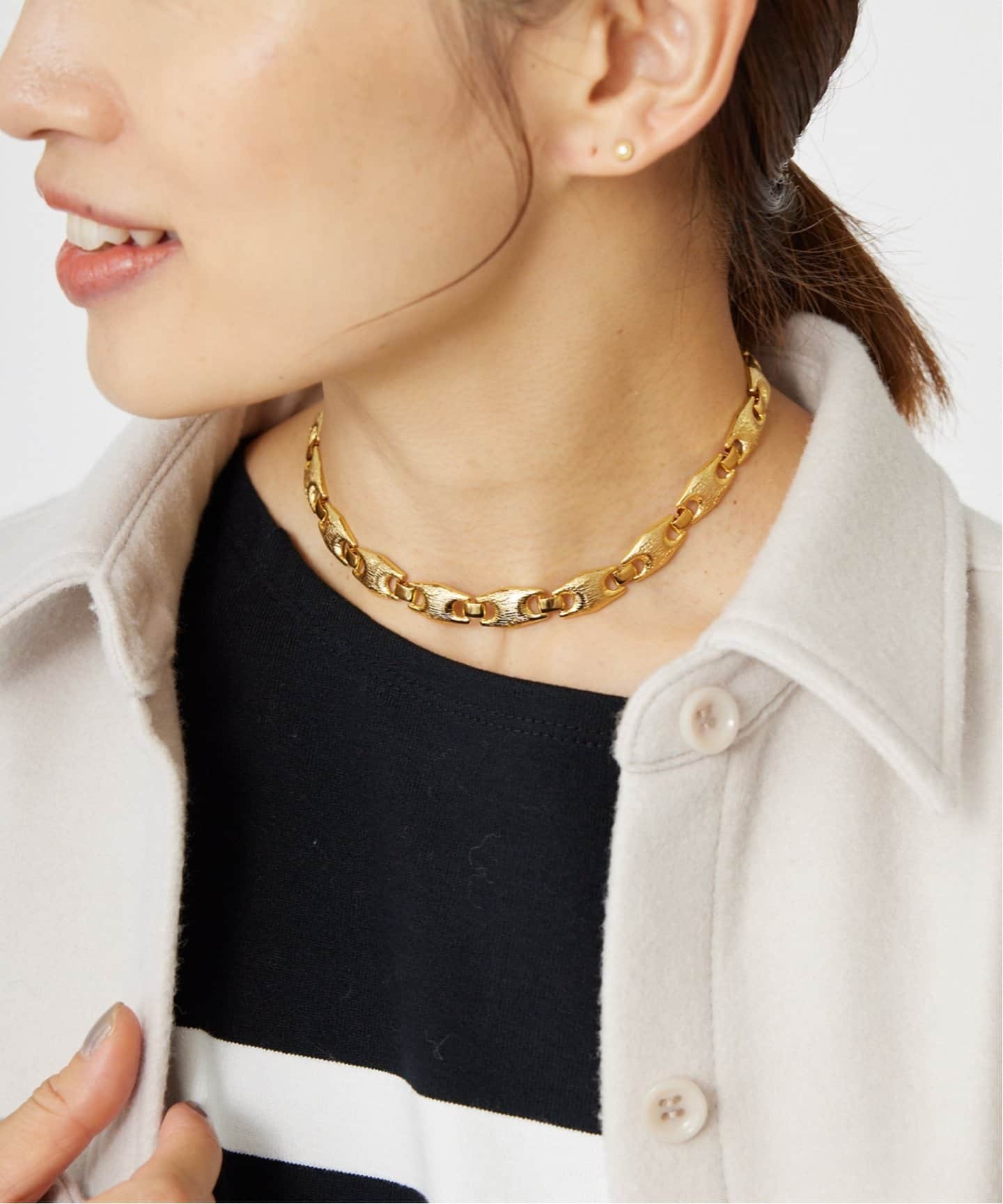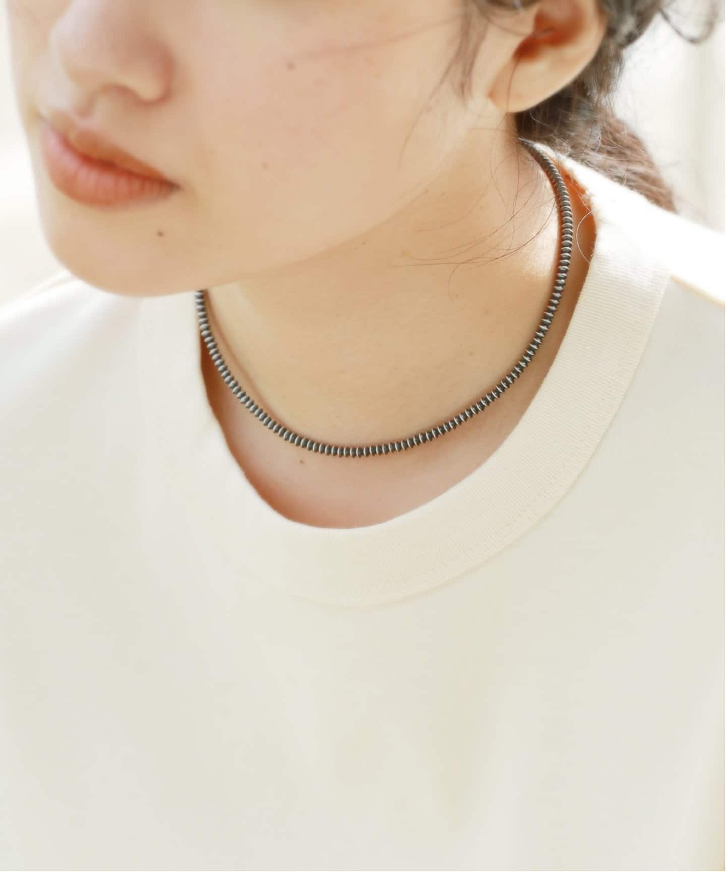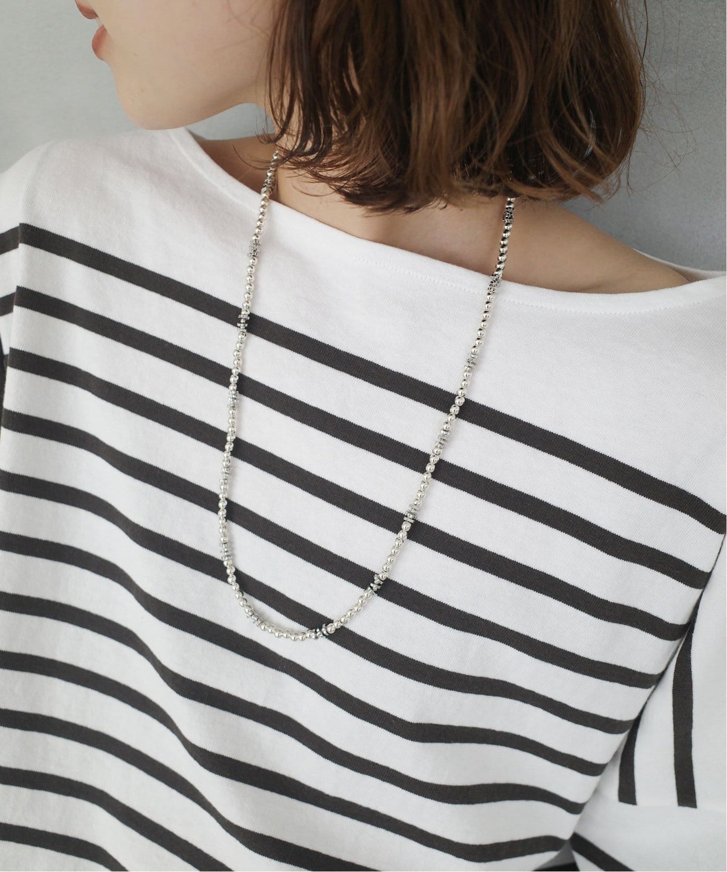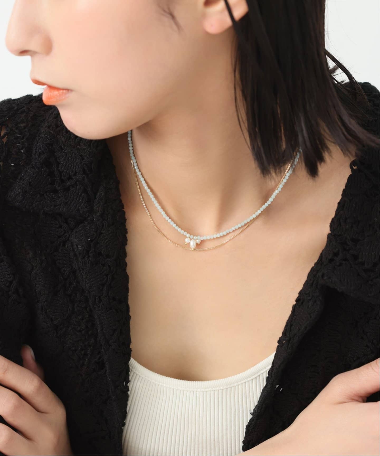 秋冬コーデに遊びと抜け感をプラス春夏のイメージが強いビーズアクセサリーだけど、メタルビーズやマットなシルバービーズなら秋冬にも大活躍。Lilasのようにあえて清涼感のあるアマゾナイトをチョーカータイプのネックレスで差し込んで、重たくなりがちな秋冬コーデに軽さを加えるのも手。