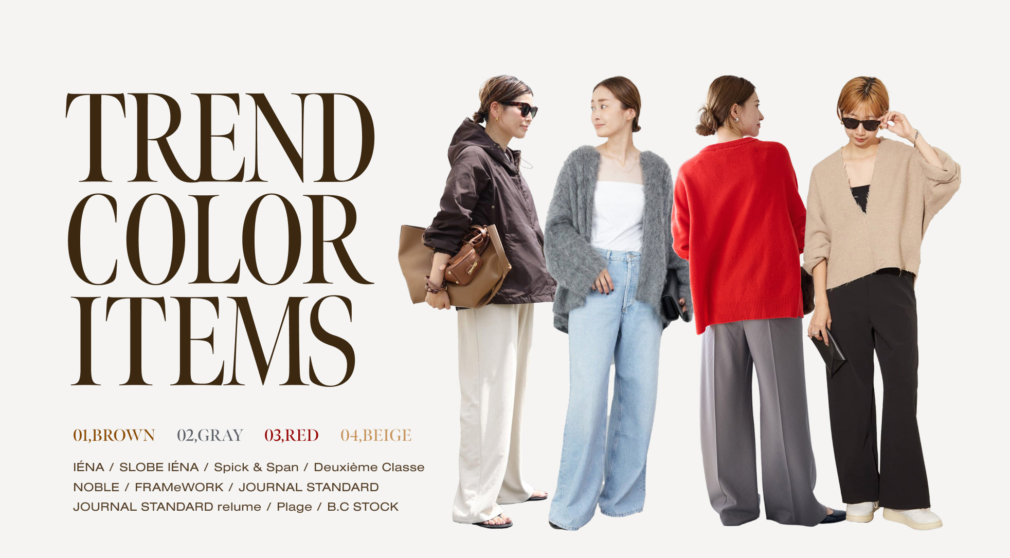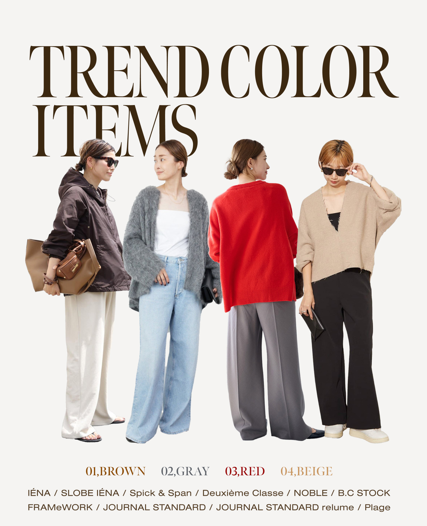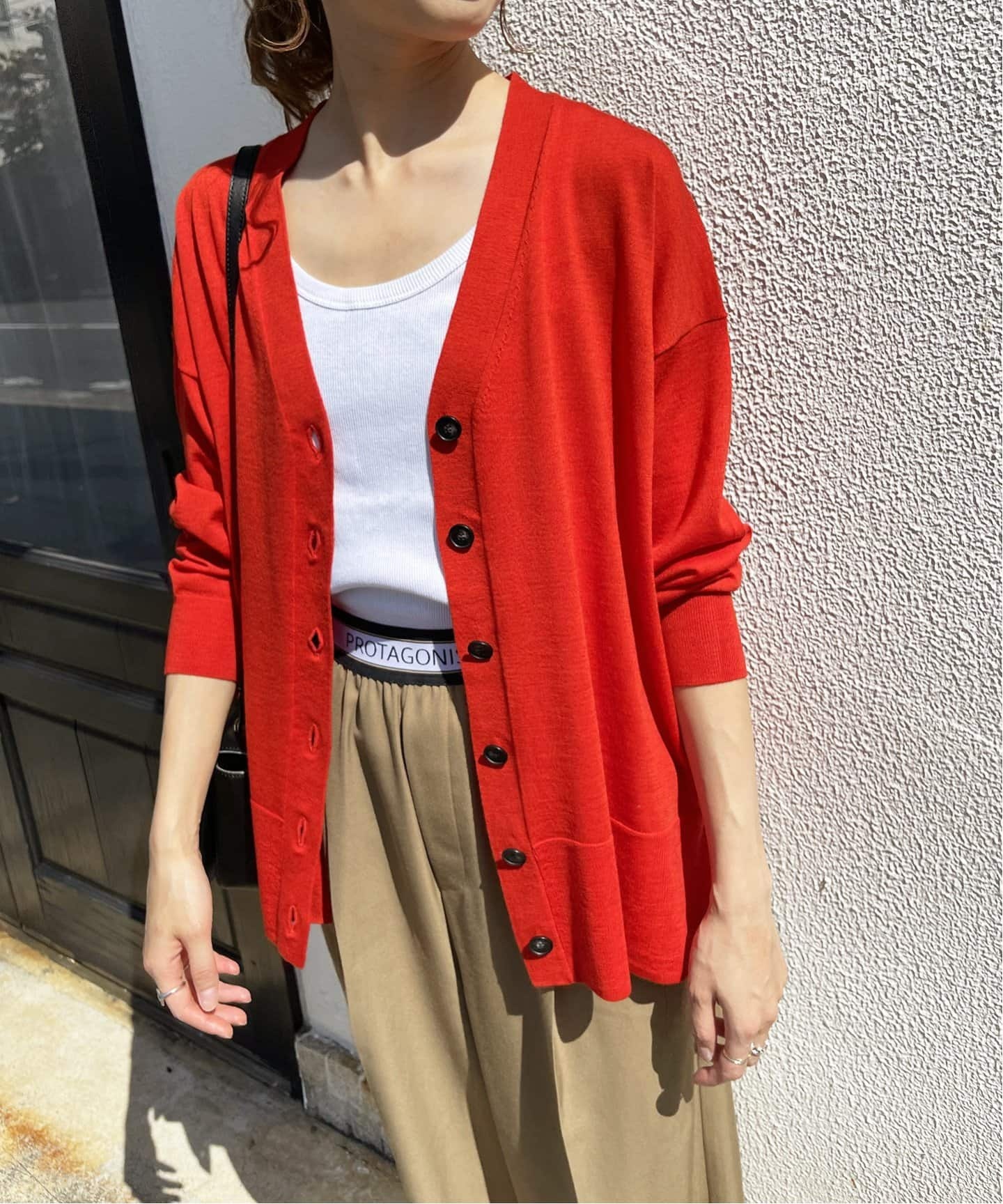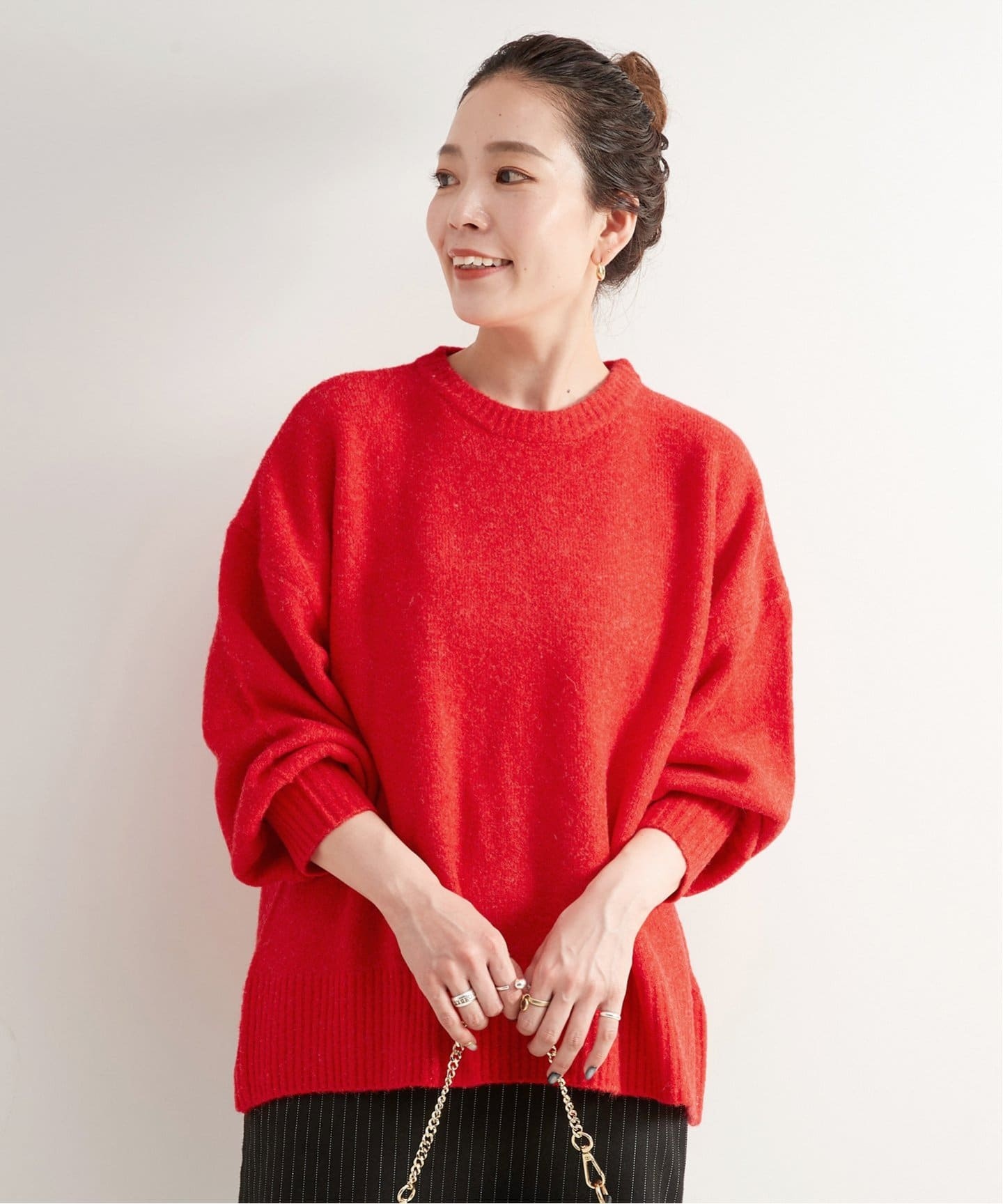 気負わずヘビロテレディなムードを引き寄せる、鮮やかなレッドがトレンド大本命。顔色を明るく見せてくれるニットなどのトップスで取り入れるのがおすすめ。FRAMeWORKラグランスリーブワイドプルオーバーのように、抜け感のあるシルエットのシンプルニットで取り入れて。