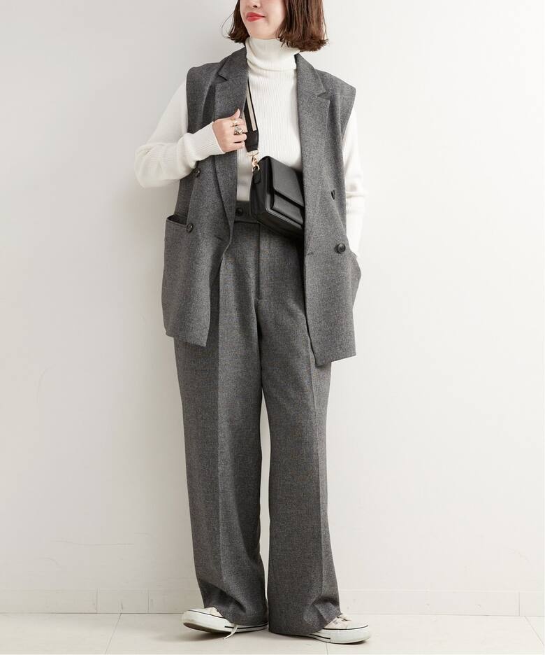 B.C STOCKのツイード風ジレとパンツとのセットは、あえてカジュアルに着こなすのが今年っぽい。Plageハミルトン リバーシャツジャケットは、シャツ感覚でさらっと羽織るだけでサマになる優秀アウター。足元は、LE TALONレザービットバブーシュをプッシュ。