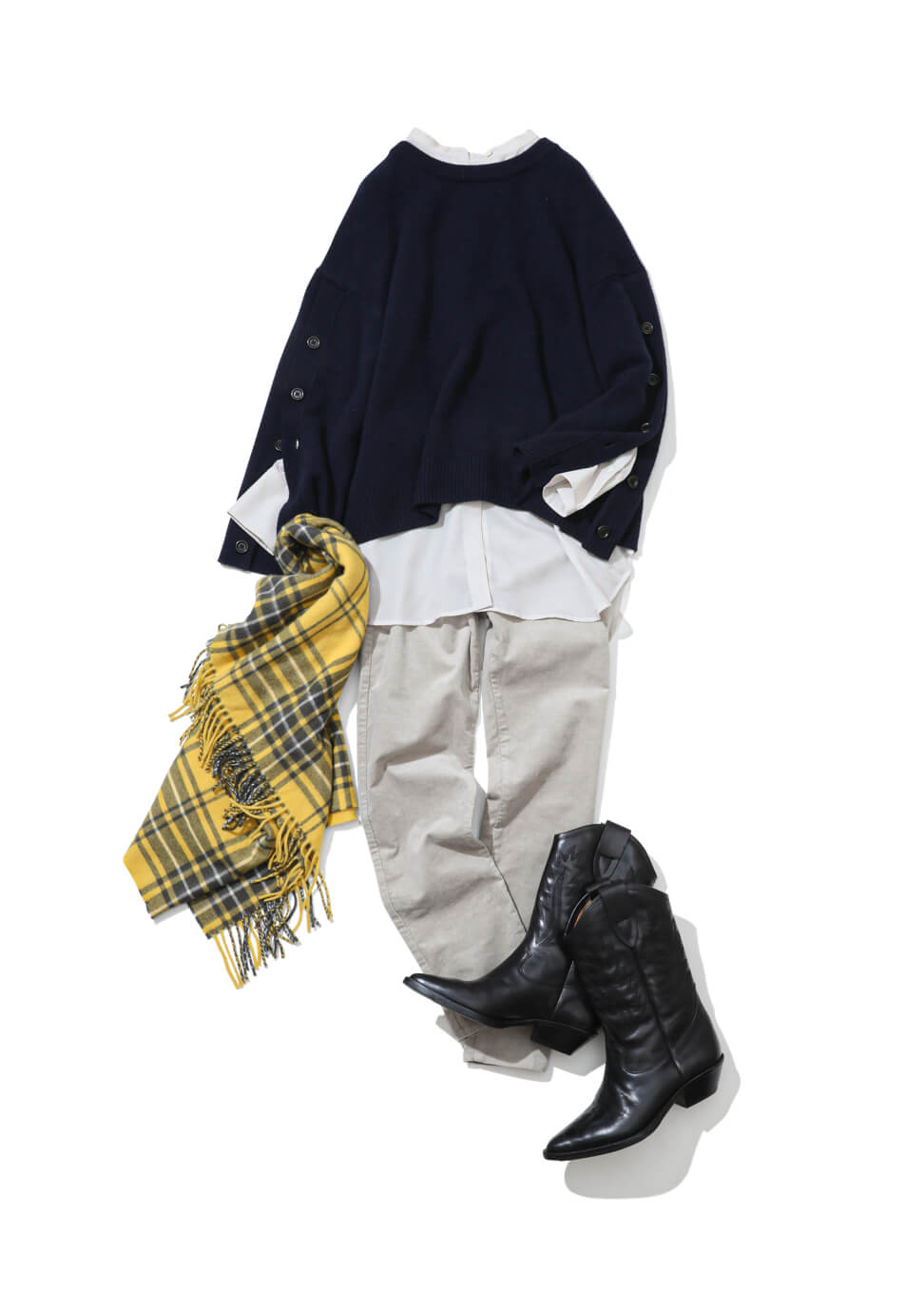 シャツとニットをレイヤードした大人トラッド。ニットのサイドボタンを外して、シャツをのぞかせるのがお洒落。王道のコンビネーションに今年らしいスパイスをのせるなら、足元で。この秋冬に人気が再燃しているウェスタンブーツなら、知的なムードに無骨なアクセントが加わってコーデの鮮度が一気にアップ!