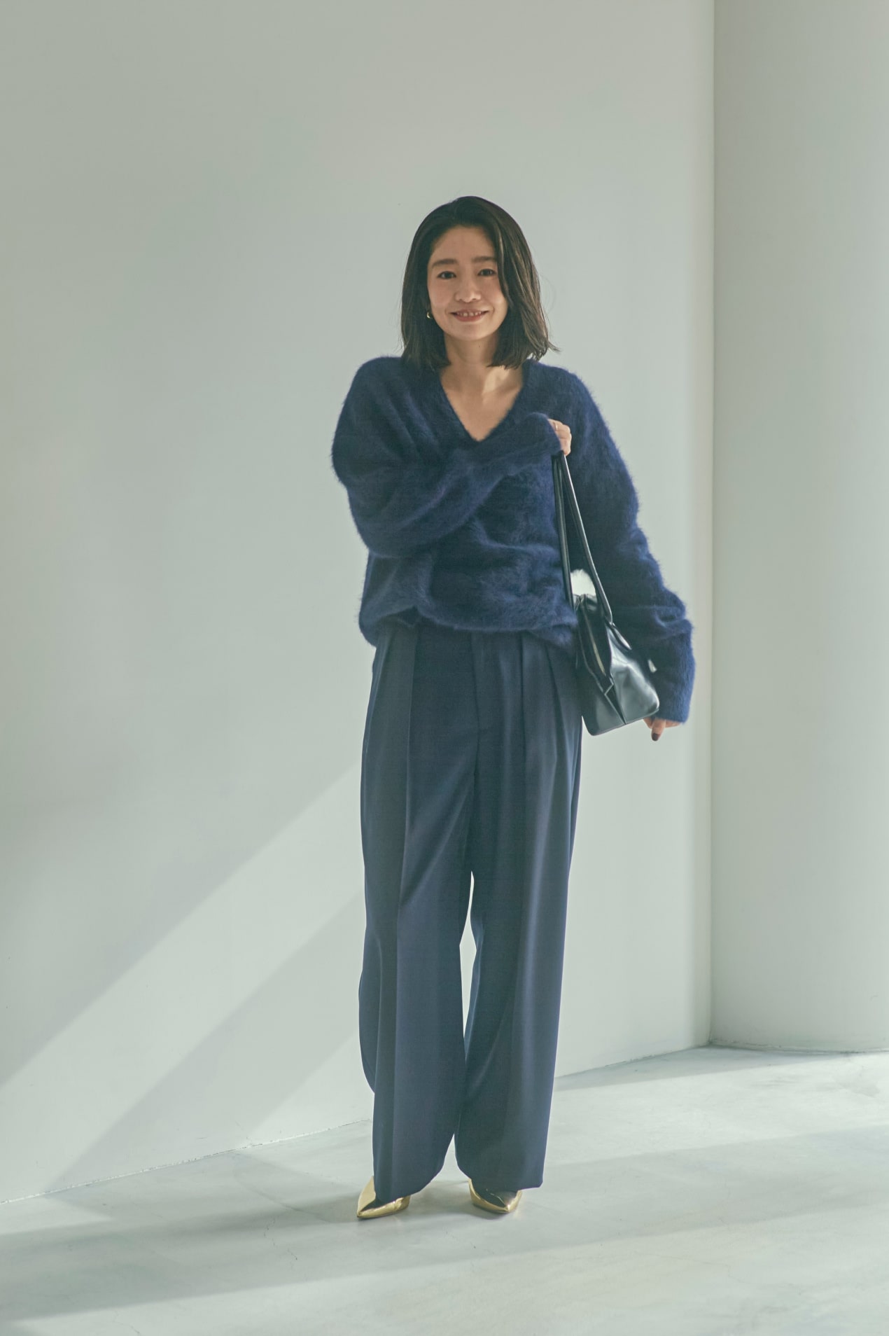 - シープエコファーコートはカーデ感覚で羽織れるデザインが今年らしくて可愛いです。ノーカラーで重ね着しやすいデザインもグッド。中には、こちらも今年っぽいややショート丈のモヘヤ混カーディガンを。トップスはアウターに色を合わせたワントーンでまとめつつ、インナーとボトムスは黒で引き締めてメリハリをつけました。足元はブーツ以外にソックス×ローファーもおすすめ。ボリュームアウターにはミニバッグが好相性です。