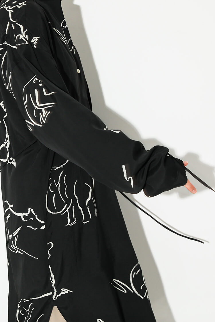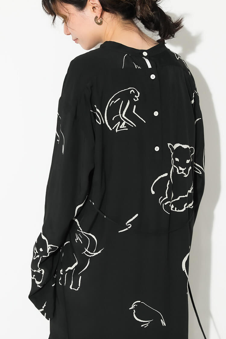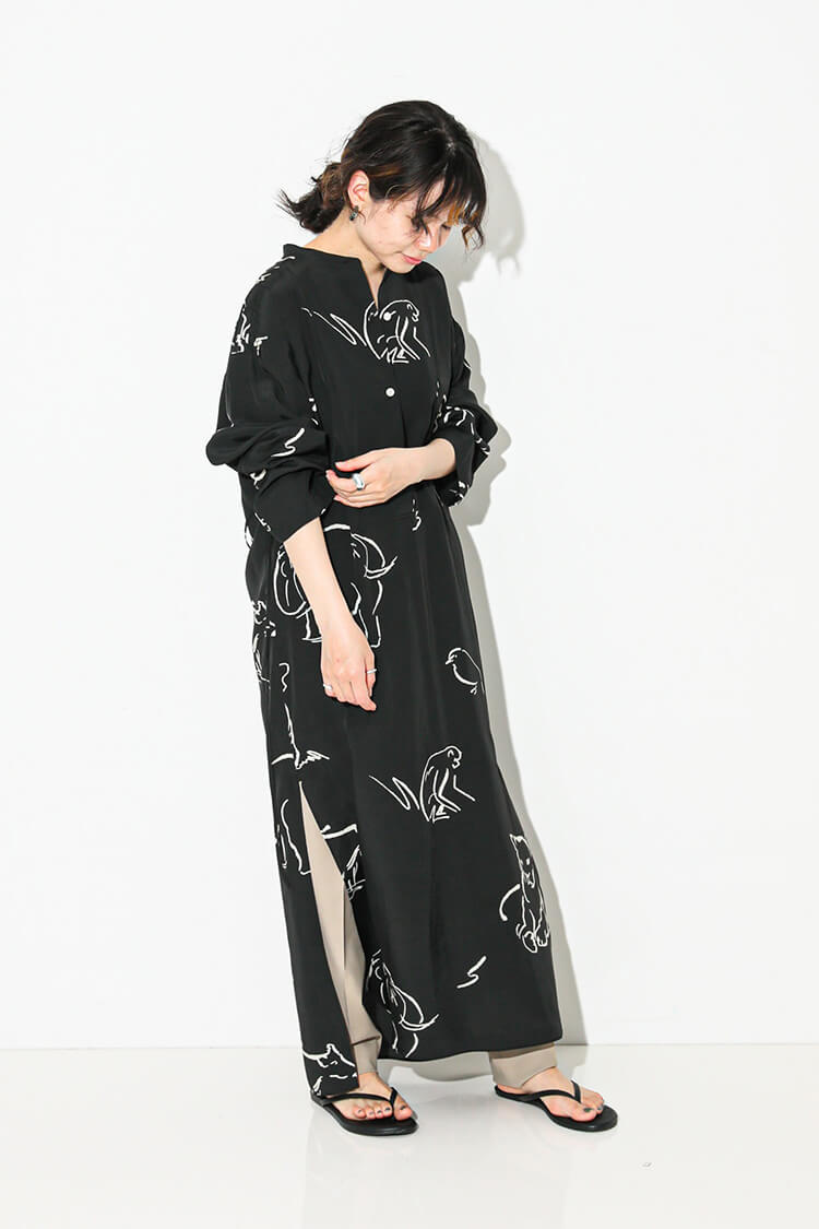 2017年秋冬に始動したウィメンズブランド。強い信念を持つ大人の女性に向けて、セットアップスタイルのアイテムをブランドの軸として展開。動物の総柄とウエストの紐が特徴のワンピースは、ゆるっと着こなしたい。