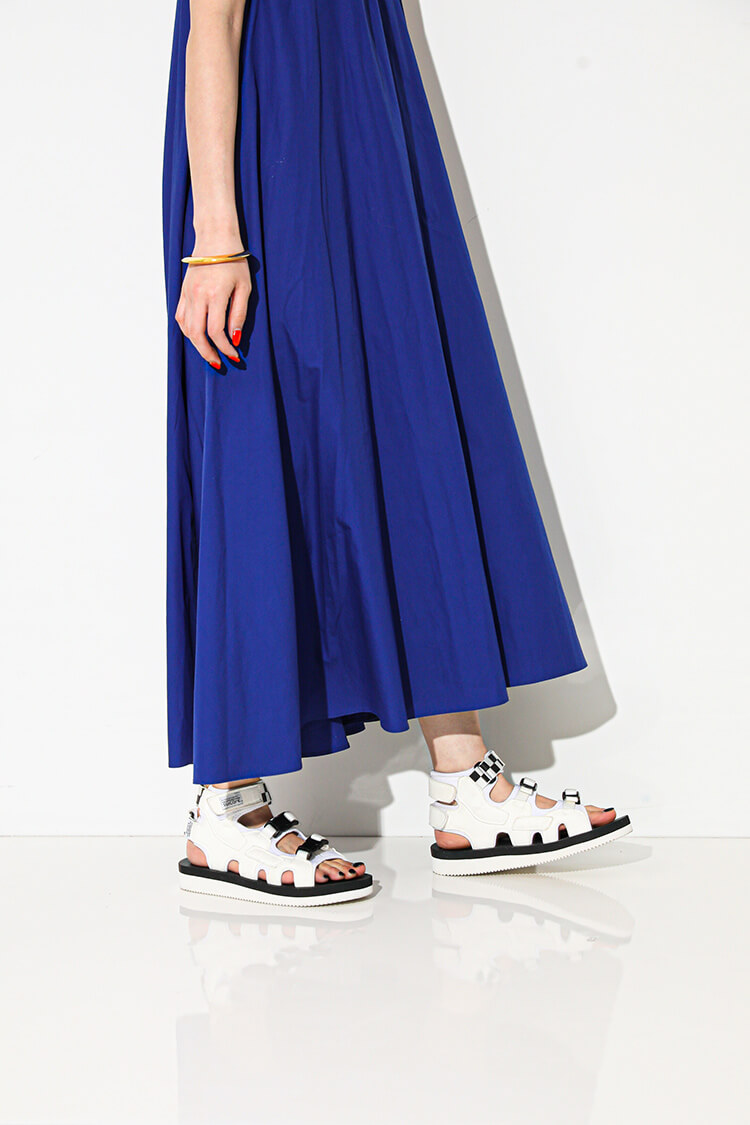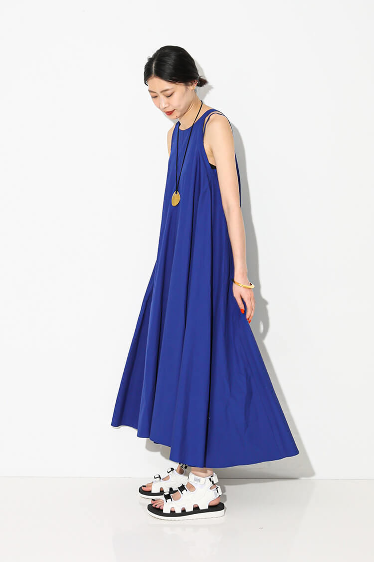 上品な光沢感のあるブロードギザコットンを使用した、SAYAKADAVISの定番ワンピース。昨年より軽くしなやかな素材をセレクトし、着心地の良さをさらに追及。ドラマティックなドレスには、スポーティーなSUICOKEを合わせて。