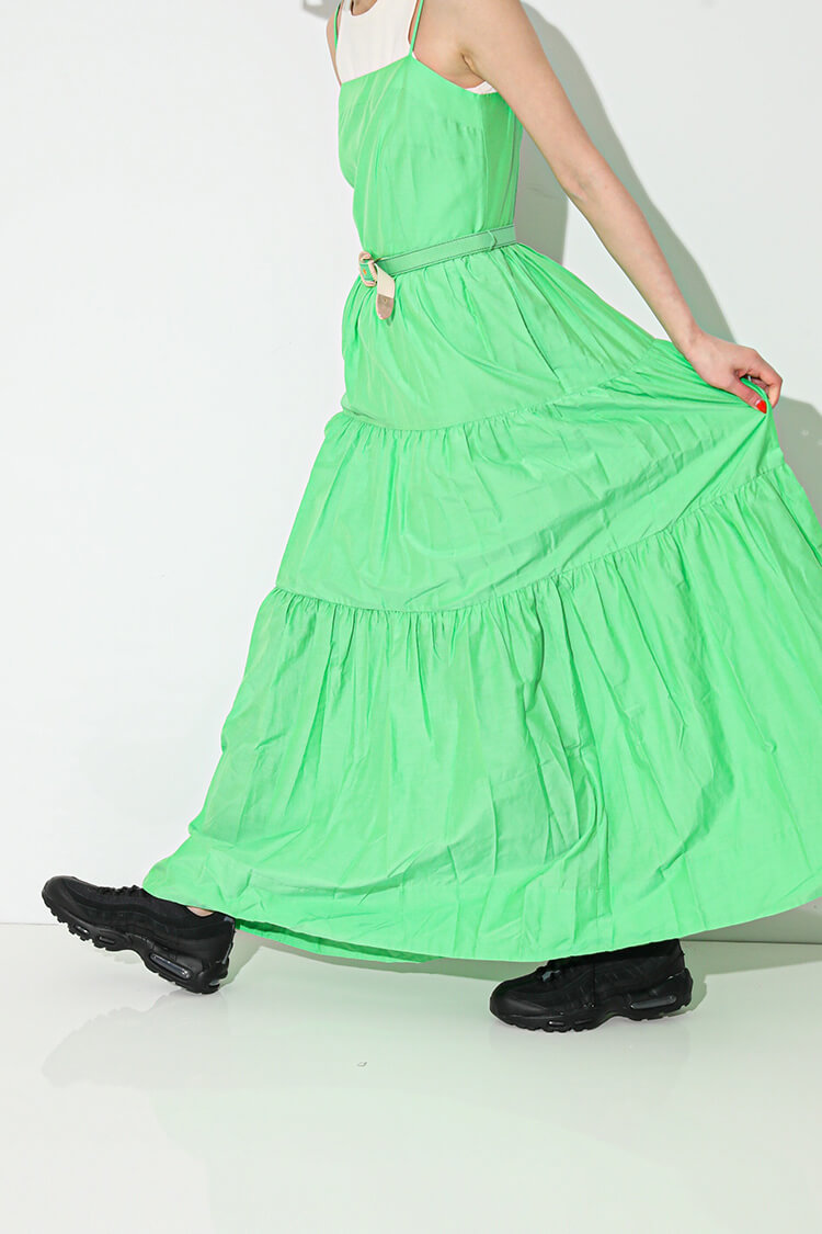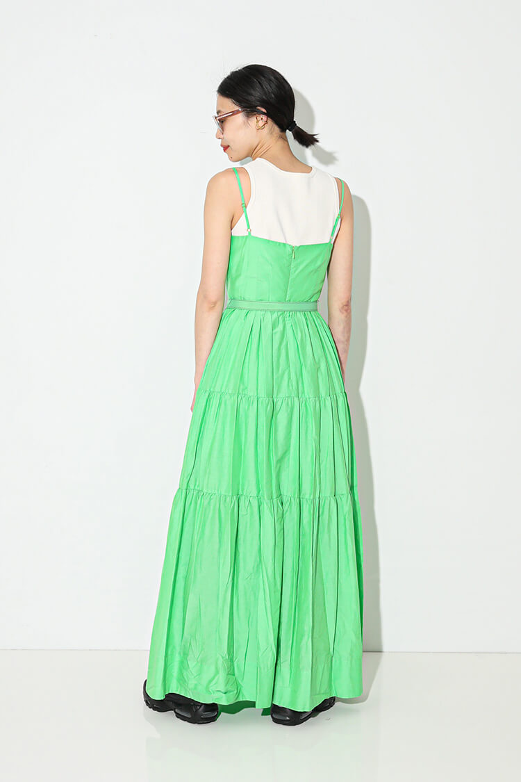 2015年にスタートした、豪メルボルン発のブランド。クチュールのような素材使いやディテールデザインを得意とし、目を引く鮮やかなプリント柄も特徴。今回のコーデは、トレンドのアメリカンスリーブタンクトップをインナーに。