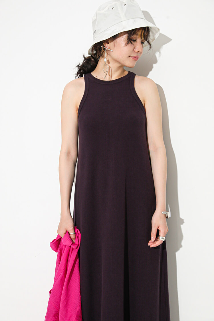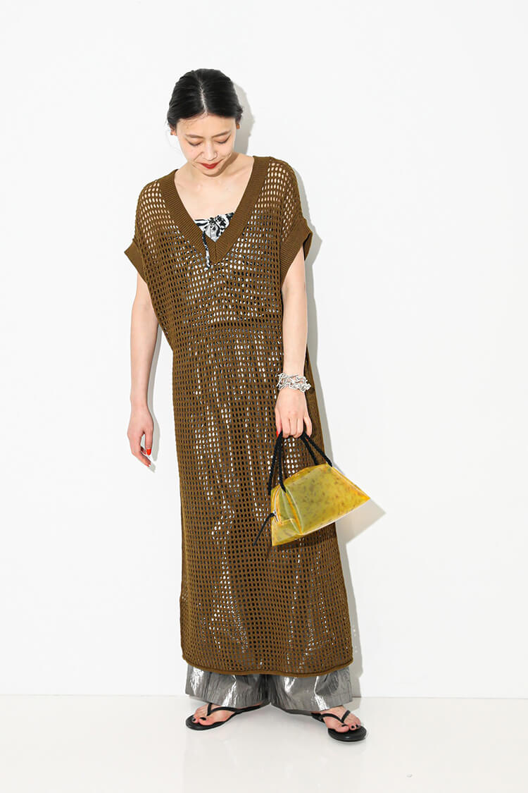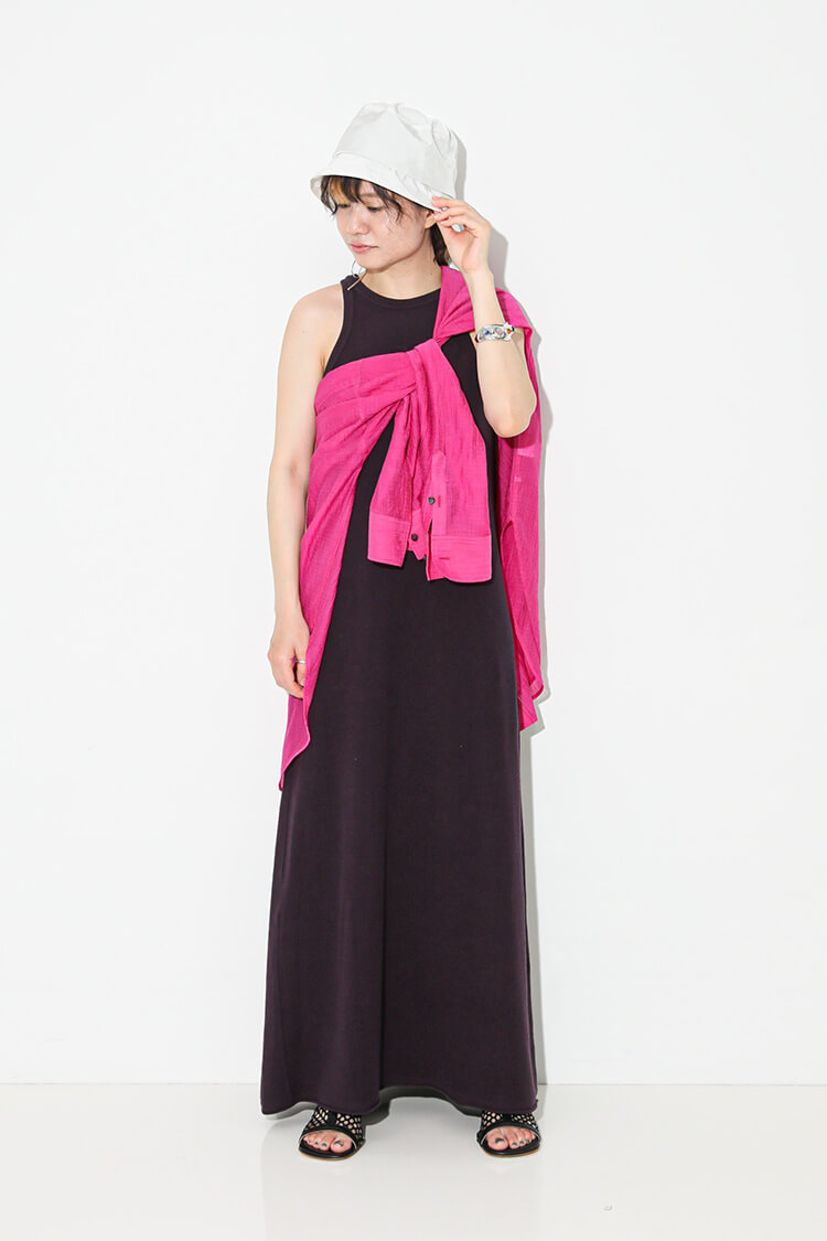 コットンと麻をブレンドした、程よいラフ感のあるドレス。前後どちらでも着用ができ、ボトムに柄物を合わせると表情がより豊かに。夏らしい透け感で、レイヤードを思い切り楽しめる1枚です!