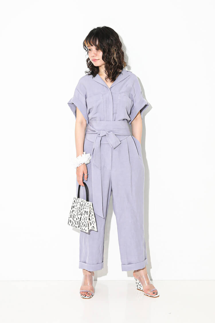 レーヨンの落ち感と、麻ならではの粗野なラフ感がある素材を使用。カジュアル過ぎず程よいモード感があるジャンプスーツ。ベルトを外しても着用できます。小物やベルト使いでモードに着こなしたい。