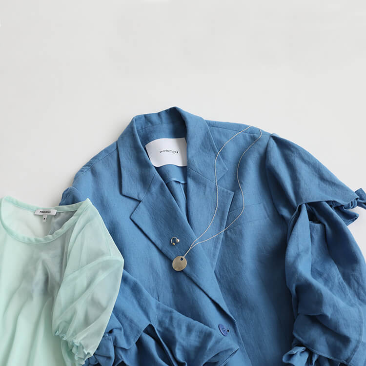 - 今シーズン最初に新調したpushBUTTONのリボンジャケット。斬新なデザインとパキッとしたブルーに一目ぼれ。シルバーアクセを重ね付けしたい気分なのでAFTER SHAVE CLUBの別注ネックレスとイヤーカフをプラス。
