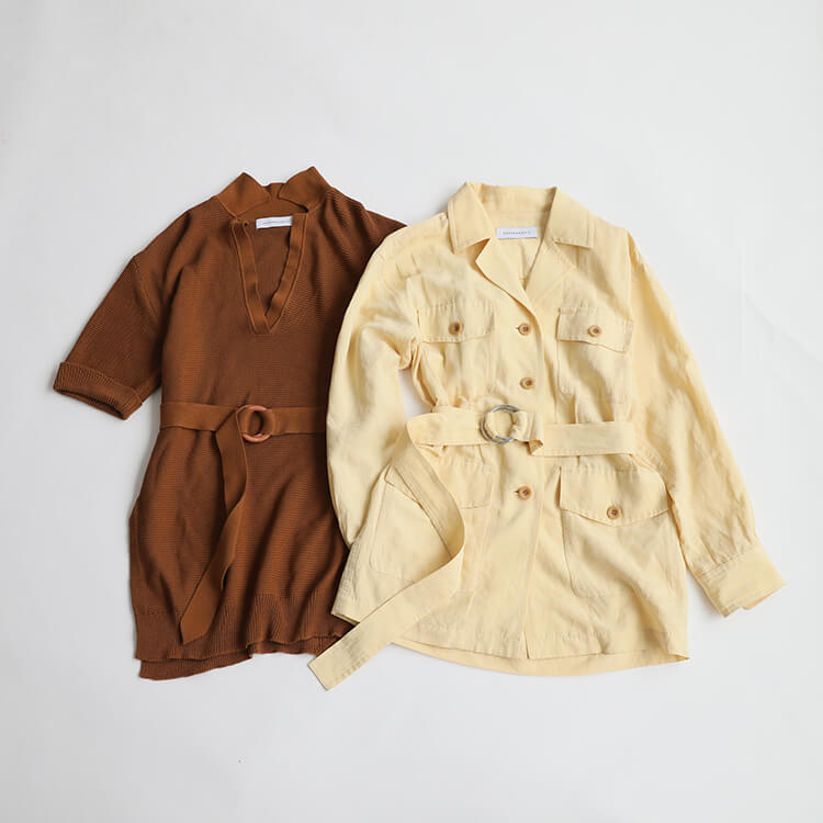 - サッシュベルトにウッドバックルがポイント。ウエストマークし雰囲気を変えて。ライトイエローとブラウンの絶妙な色合いが素敵
