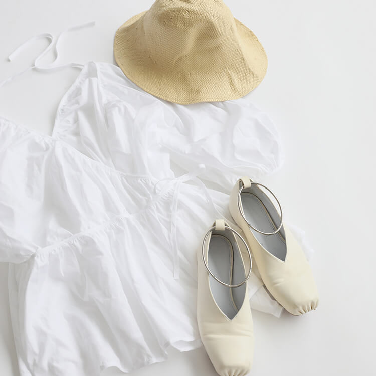 少し甘めのディティールには、リラックス感のあるワイドパンツでバランスをとって。