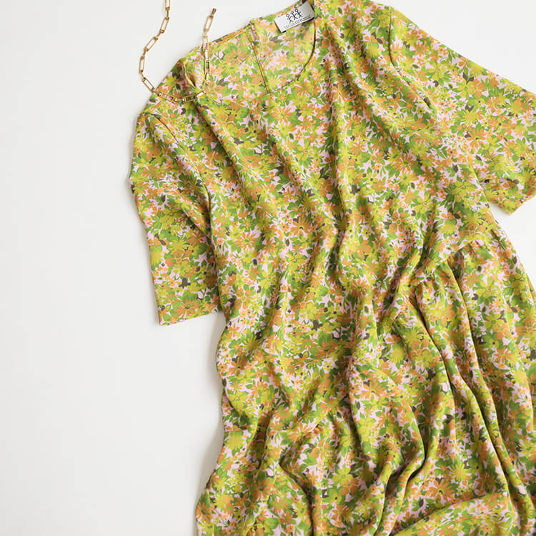 スリットからちらっと見えるキーカラーのグリーンをベースにしたアーティスティックなプリントスカートを加えて単調さを回避。
