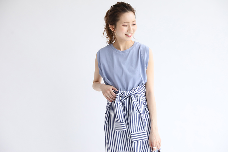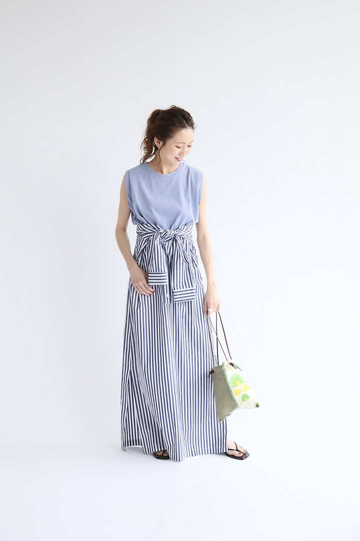 タックスリーブレスをインした、夏らしい爽やかなブルートーンコーデ。ボトムスは実は、シャツワンピース。ウエスト位置で袖を結び、マキシスカートとしてアレンジ。