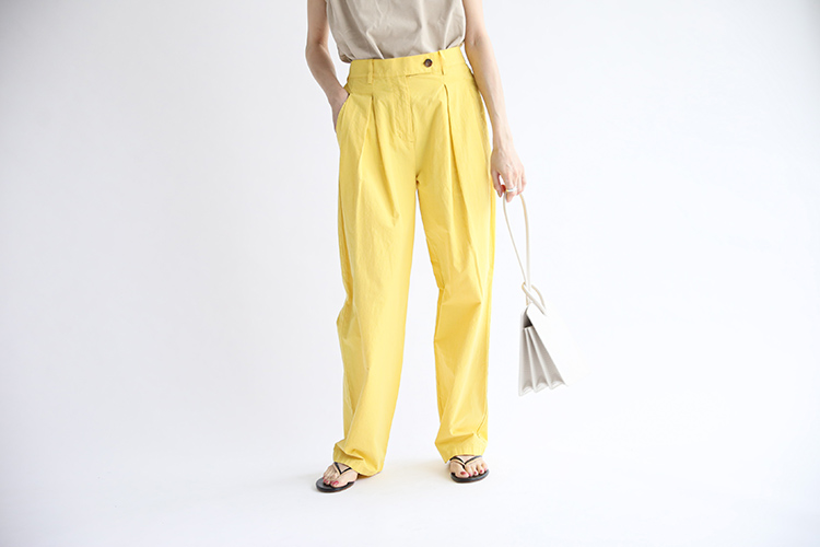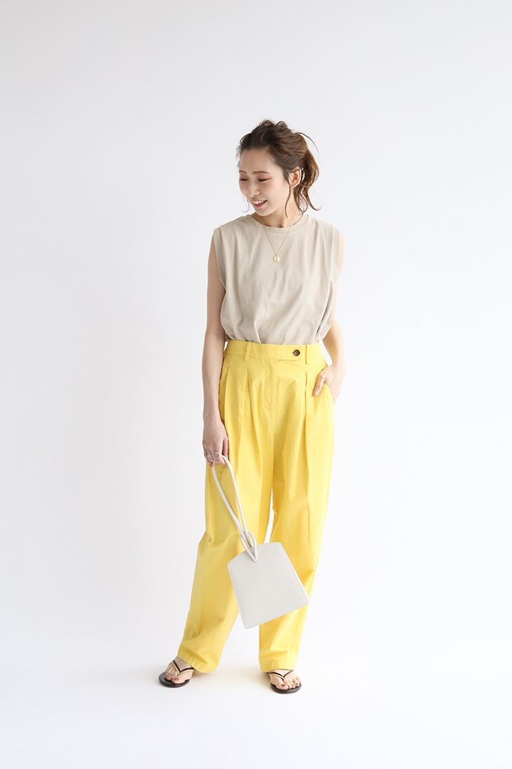 - パッと目にとまるキレイ色パンツは、春から継続してトレンドの主役ボトムス。暖色同士で相性のよいイエローを大人っぽくなじませるベージュのタンクが名脇役に。