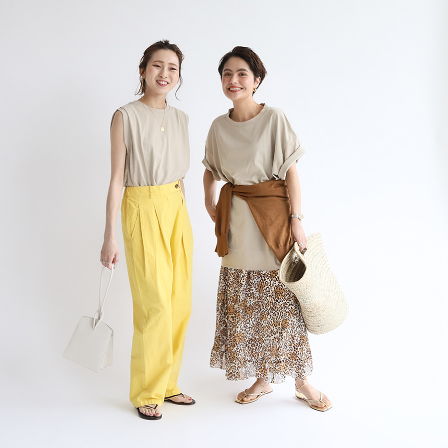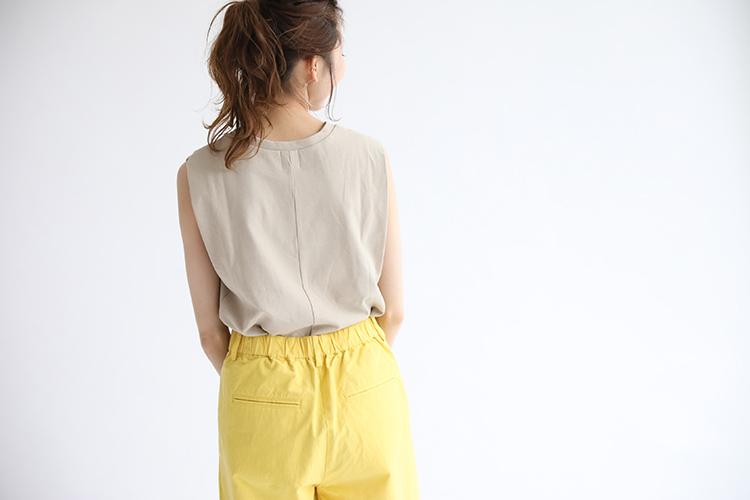 パッと目にとまるキレイ色パンツは、春から継続してトレンドの主役ボトムス。暖色同士で相性のよいイエローを大人っぽくなじませるベージュのタンクが名脇役に。