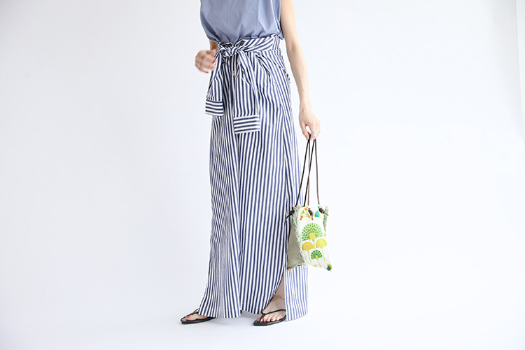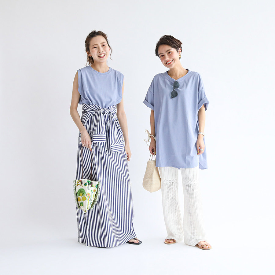 - タックスリーブレスをインした、夏らしい爽やかなブルートーンコーデ。ボトムスは実は、シャツワンピース。ウエスト位置で袖を結び、マキシスカートとしてアレンジ。
