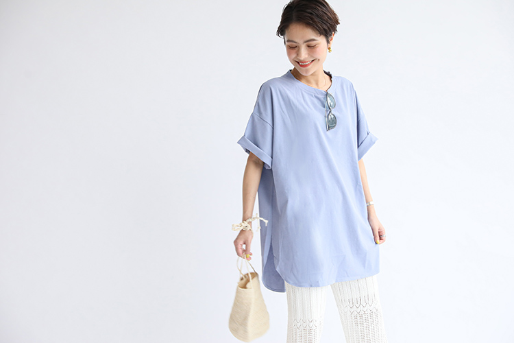 - 表情豊かなラウンドヘムラインの部分だけをあえてアウトして楽しむスタイリングもおすすめ。フロントはすっきりするので、ワイドボトムスともグッドバランス。