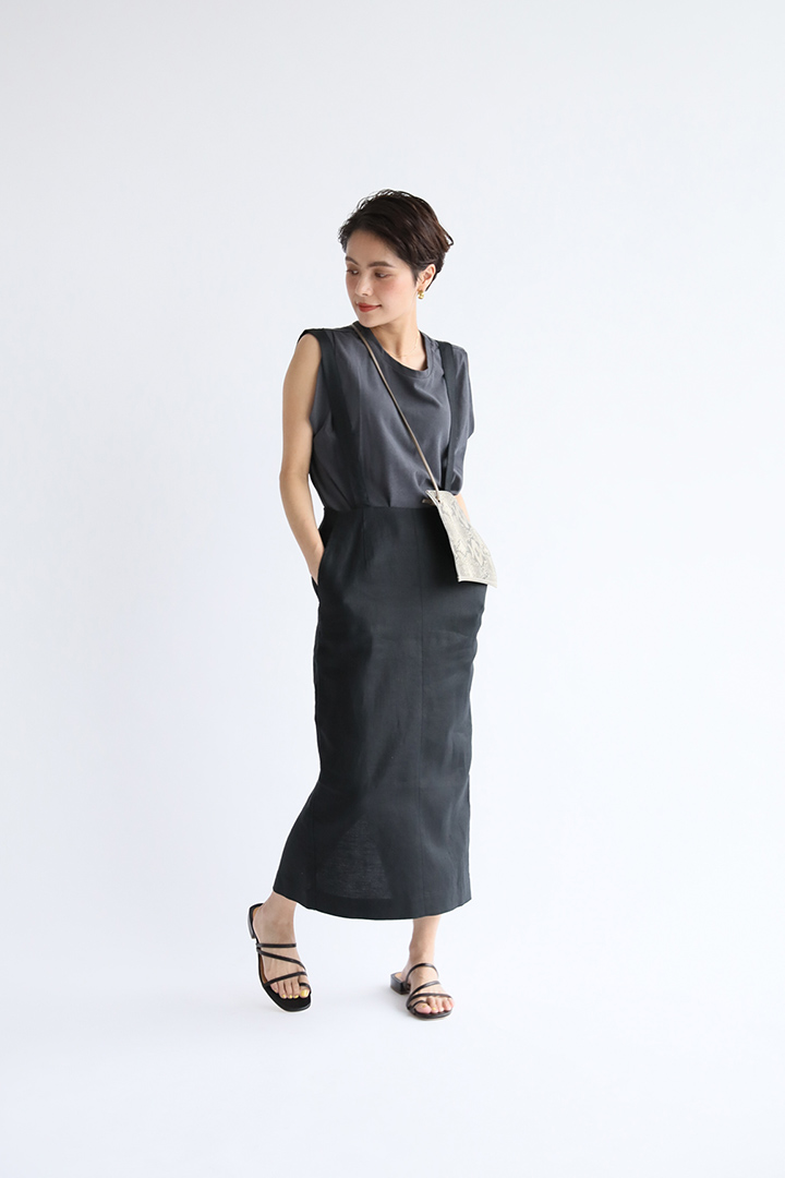 - クールだけど女っぽさも醸せる、タックスリーブレスとIラインスカートのワンツーコーデ。トーンを暗めで統一して辛口小物で仕上げれば、さらにモダンな雰囲気に。