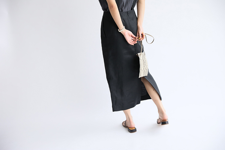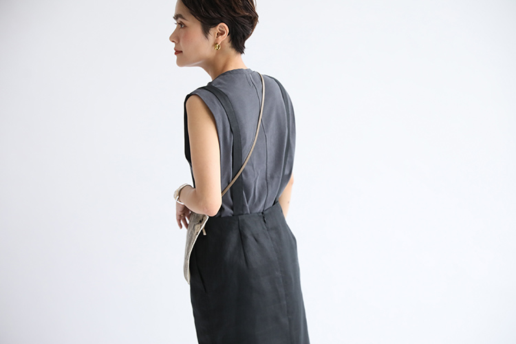 クールだけど女っぽさも醸せる、タックスリーブレスとIラインスカートのワンツーコーデ。トーンを暗めで統一して辛口小物で仕上げれば、さらにモダンな雰囲気に。