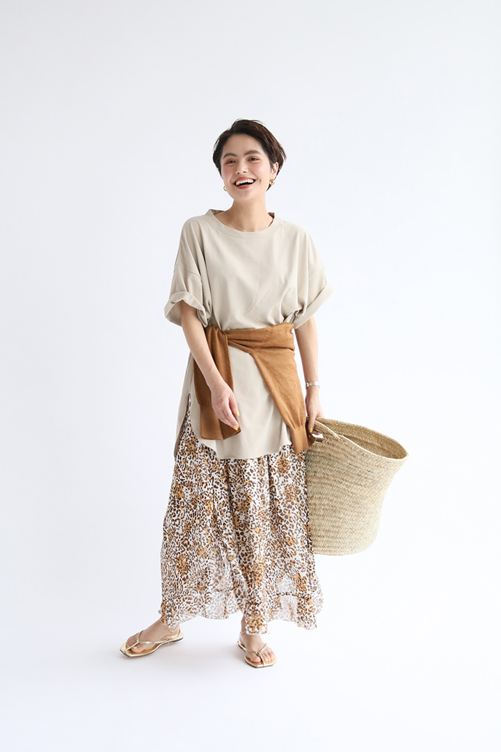 フェミニンなスカートコーデを、あえて土っぽいアースカラーでまとめることで洗練度がアップ。ビッグTのウエストにカーデを差し込んで、メリハリを加えて。