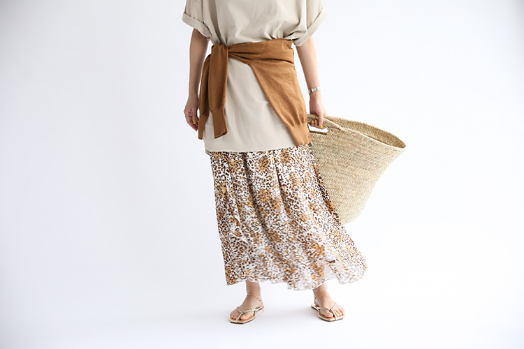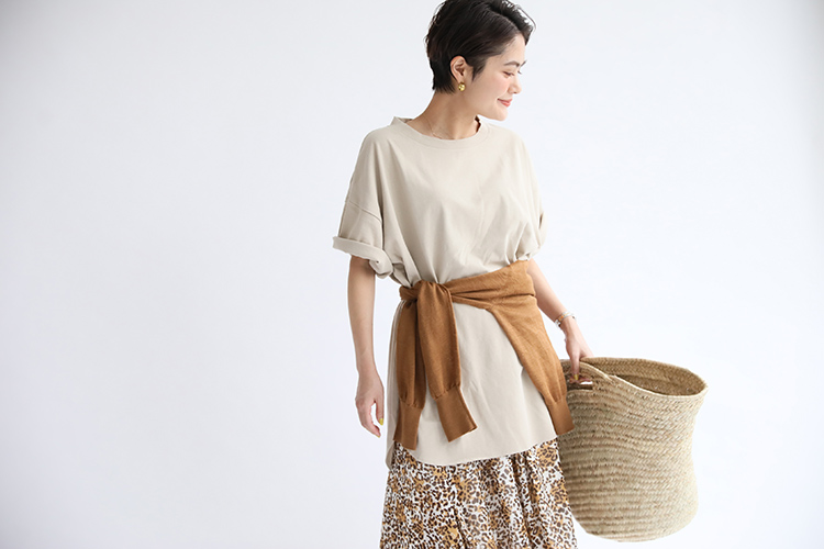 - フェミニンなスカートコーデを、あえて土っぽいアースカラーでまとめることで洗練度がアップ。ビッグTのウエストにカーデを差し込んで、メリハリを加えて。