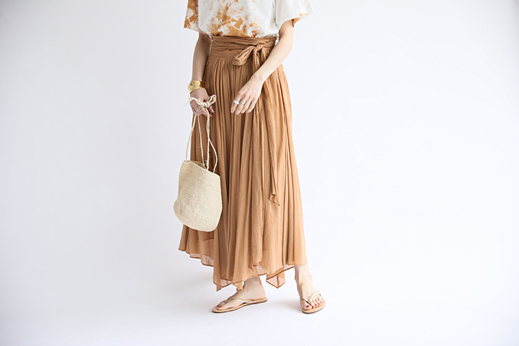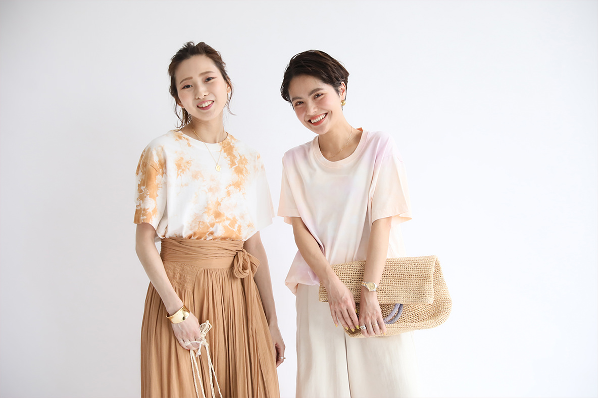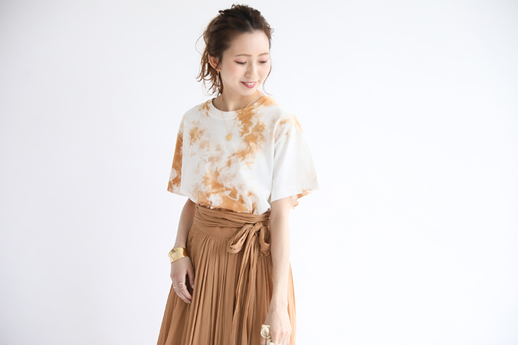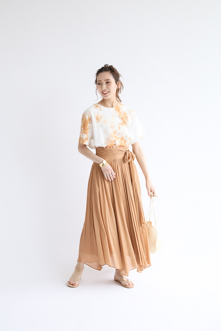 体が泳ぐゆったりシルエットにプリミティブなタイダイ模様をのせたTシャツなら、いつものフレアスカートコーデがぐっと垢抜けてブラッシュアップ。
