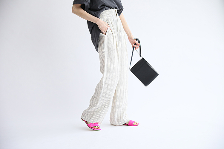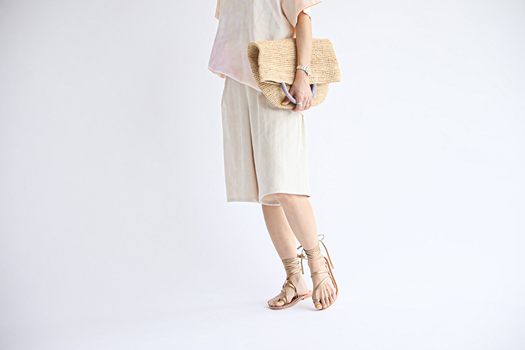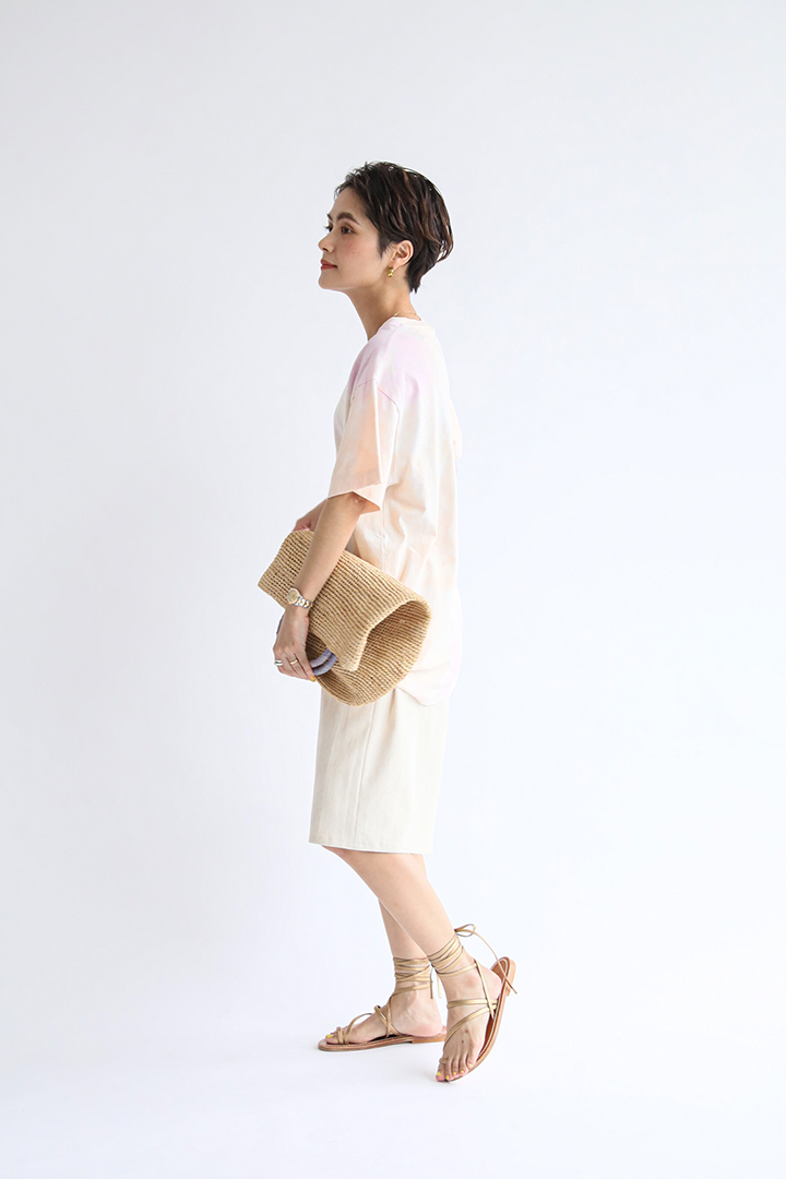- ほんのりにじんだピンクが甘くなりすぎず、ドライなタッチのハーフパンツとも好相性。ナチュラル素材のバッグとレースアップサンダルをMIXして、夏らしい雰囲気を高めて。
