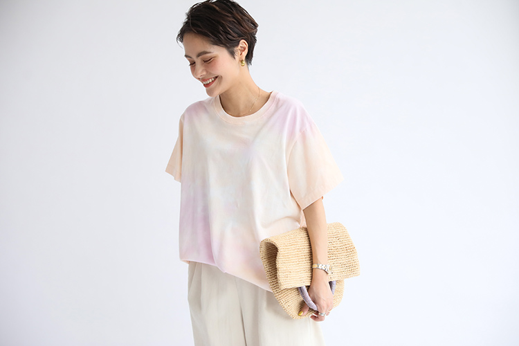 - 体が泳ぐゆったりシルエットにプリミティブなタイダイ模様をのせたTシャツなら、いつものフレアスカートコーデがぐっと垢抜けてブラッシュアップ。
