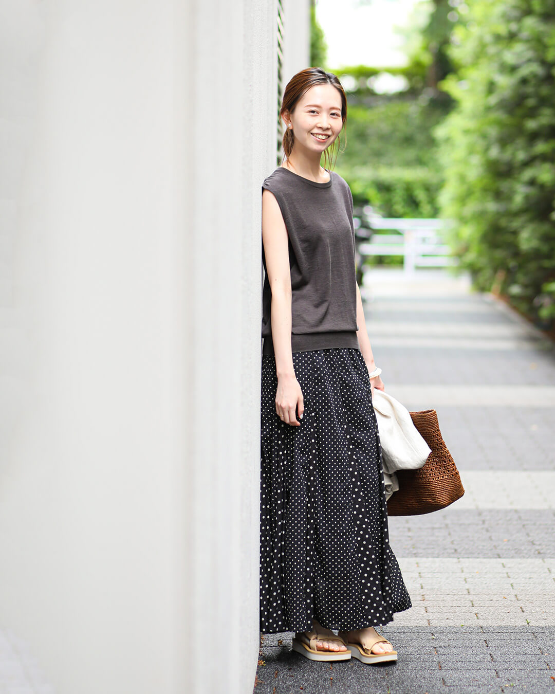 - コットン麻で涼しげニットは重たく見えないブラックがコーデを格上げ。