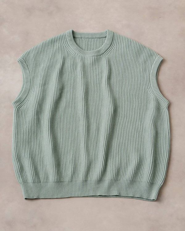 - 極上のニットウェアを編み出すCREPUSCULEと417 EDIFICEによるニットベストはスモーキーなグリーンがいまの気分。ゆとりのあるサイズ感としなやかな伸縮性のコットン地を使用しており、オールシーズン着用可能。今季はあえて、無地のTシャツの上に重ねるのがおすすめ。