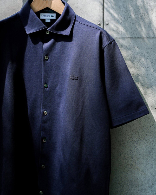 - LACOSTEにビジネスシャツとカジュアルの両方のシーンで羽織れるシャツをEDIFICE別注で実現。多種多様なシーンでの着用を考え、ミリ単位での修正をかけたこだわりの襟型と台襟仕様がスマートな雰囲気を演出。生地には清涼感のあるクールマックスカノコ素材を採用し、これからの季節に手を伸ばしたくなる一着に仕上げました。