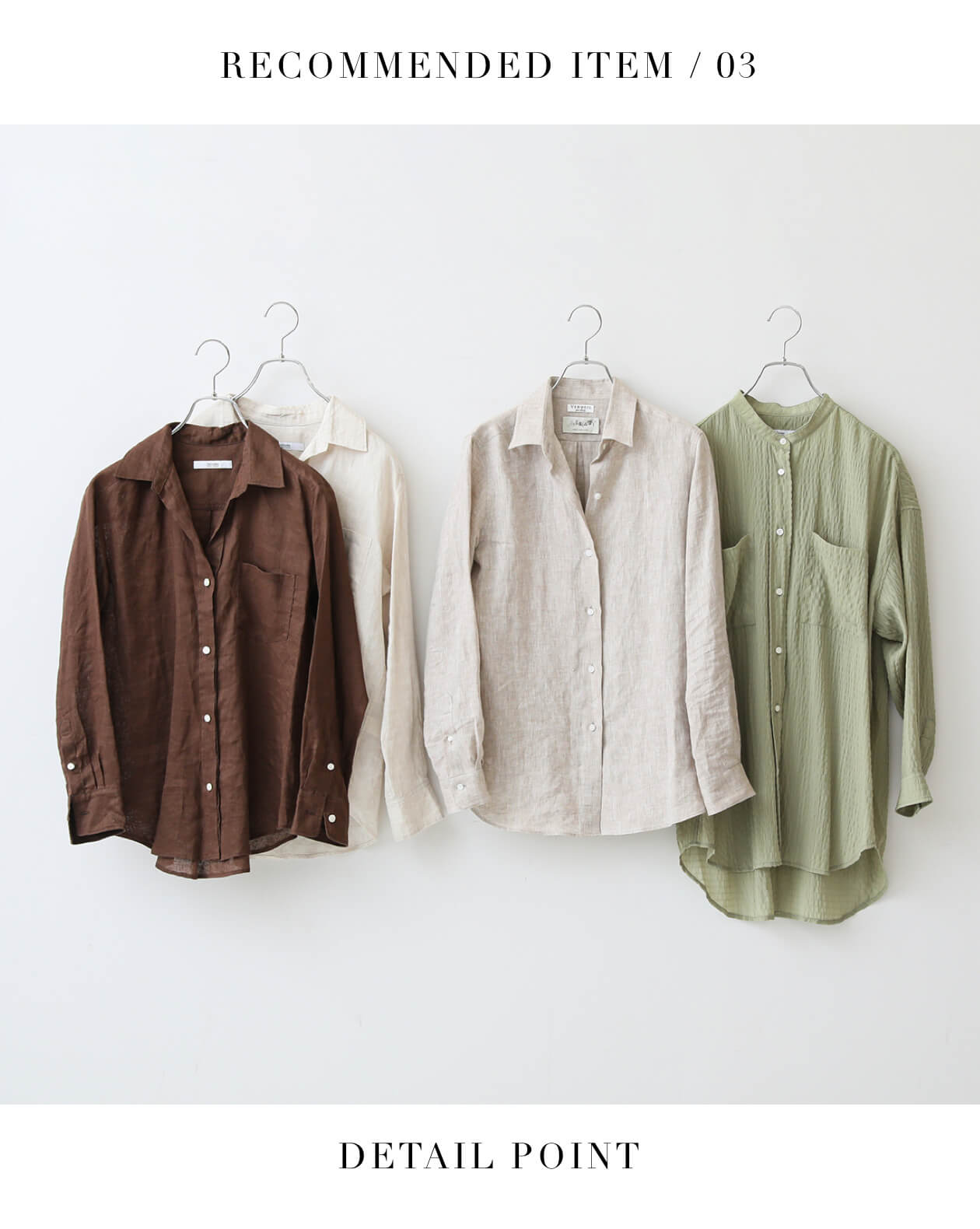 オータムさんらしいディープな色味のシャツは、リネンやシアサッカーなどの夏素材で軽い着こなしに。真っ白ではなくリネンなどの風合いのあるベージュがオータムさんの肌色ともマッチします。体が泳ぐゆったりサイズなら、汎用性も高くラフなこなれ感が加速。カジュアルな着こなしにはブラウンや、トレンド感のあるピスタチオグリーンもおすすめ。