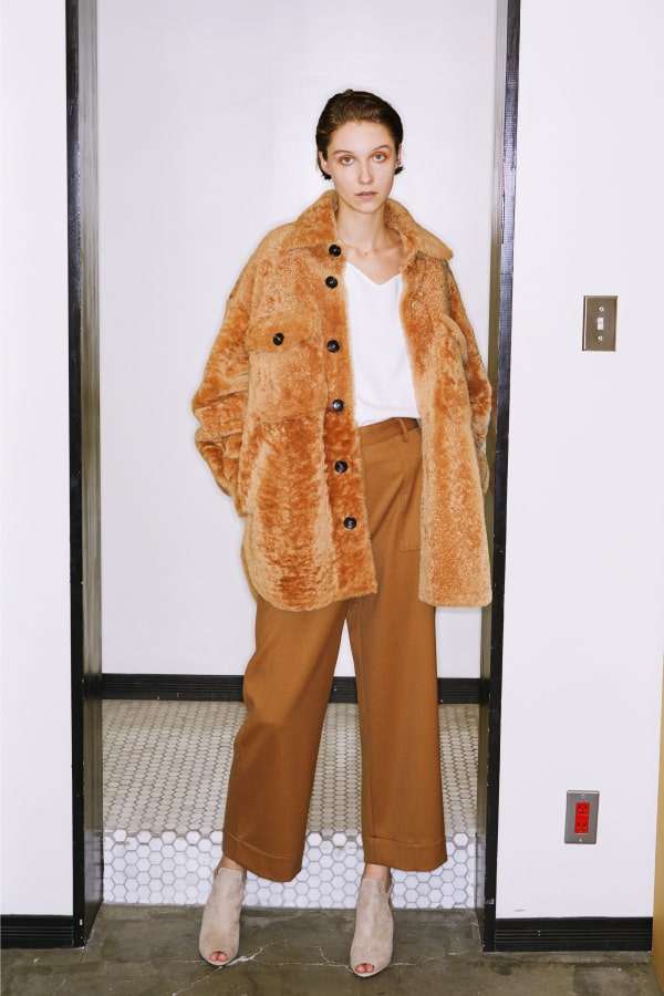 ボリュームのあるムートンシャツには、鎖骨が綺麗に見えるサーマルトップスを。