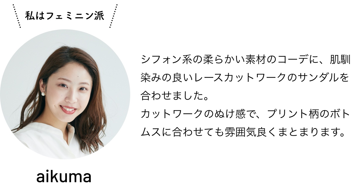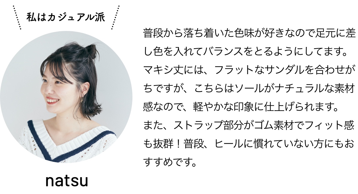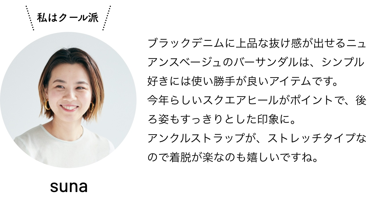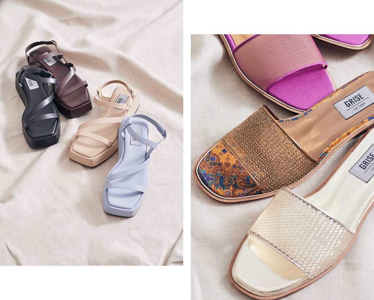 - シンプルなスタイリングには、足元にモードなアクセントをプラス。トレンドのトラペーズソールのワンカラーサンダルや、キャッチーな色使いが目を引くスライダーサンダルでコーディネートをアップデート。