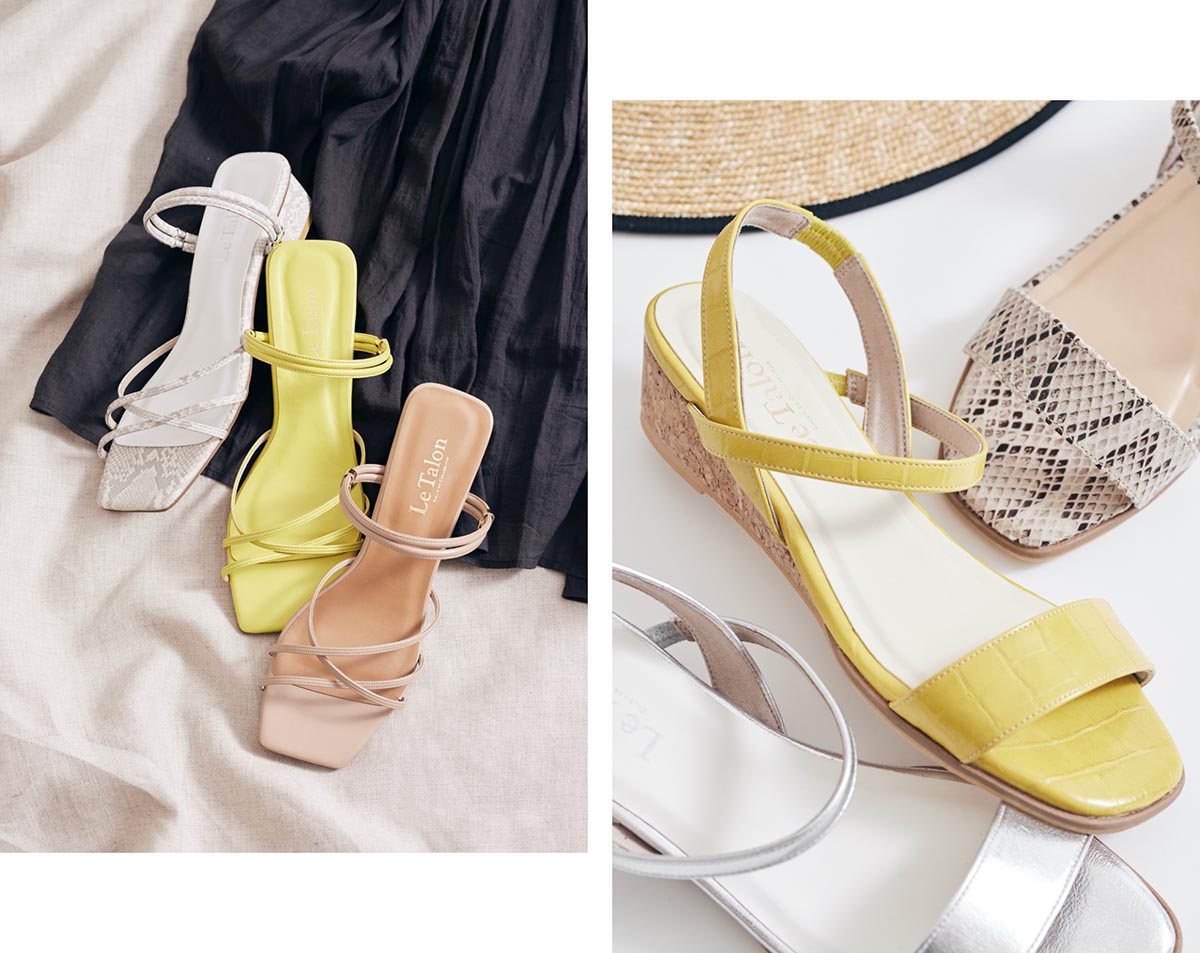 - カジュアル派におすすめしたいのは、チアフルなイエローやほんのり辛口なパイソン柄。トレンド感満載のスクエアトゥや、程よいボリュームのウエッジソールが気の利いたデザイン。