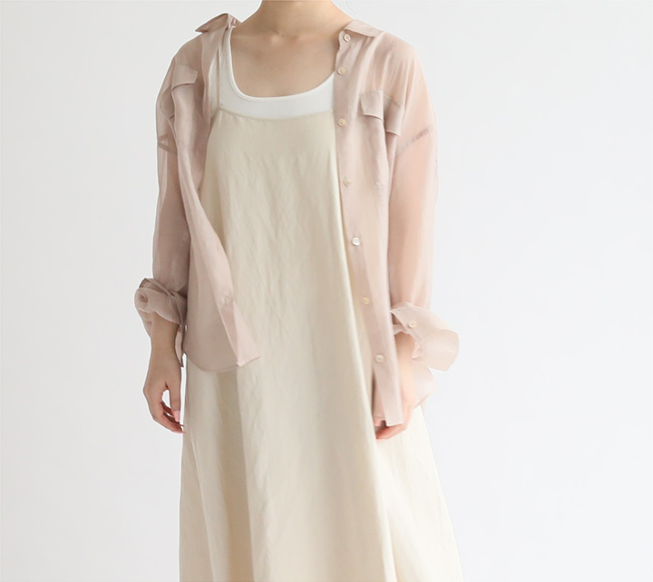 大きめのメンズライクな佇まいに対して、繊細な落ち感のある素材で女性らしさもプラス。