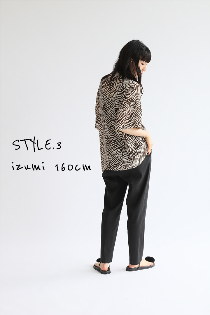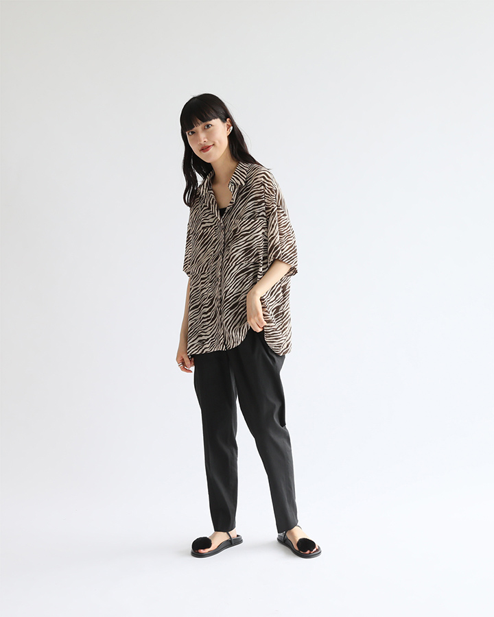 フロントを閉めて1枚で存在感を出したり、ワンショルダーのタンクトップに羽織ったりしても素敵。- JOURNAL STANDARDゼブラプリントハーフスリーブシャツ¥16,500(税込)