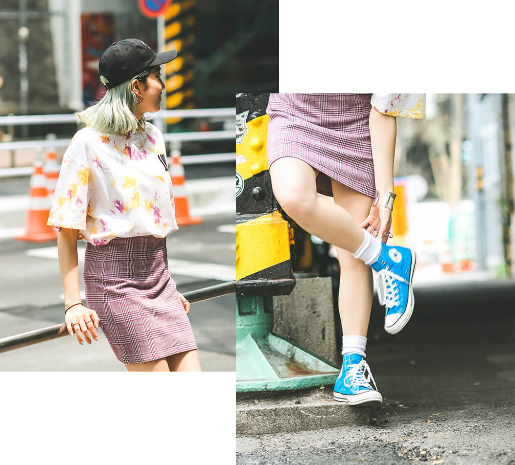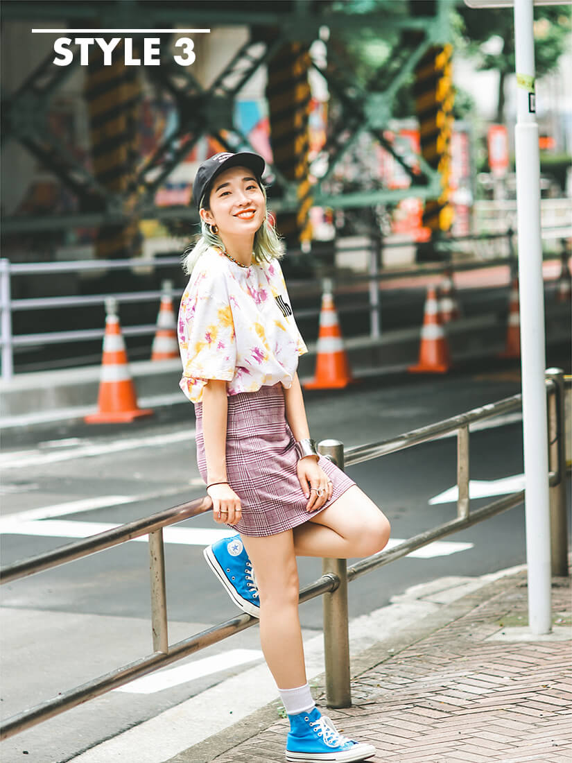 - チェックのミニスカートは、タイダイTやCAPであえてメンズよりのスタイリングにしました。