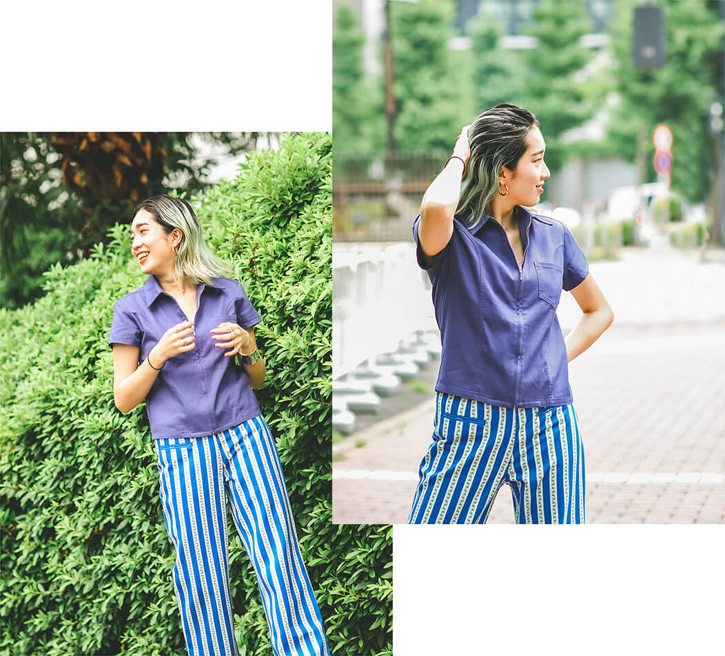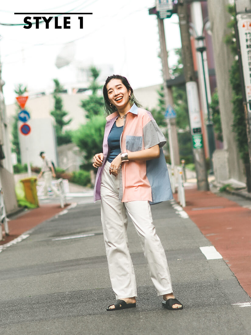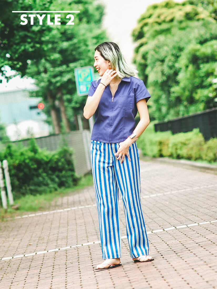 柄パンツと合わせてコーディネートにメリハリを出しました。