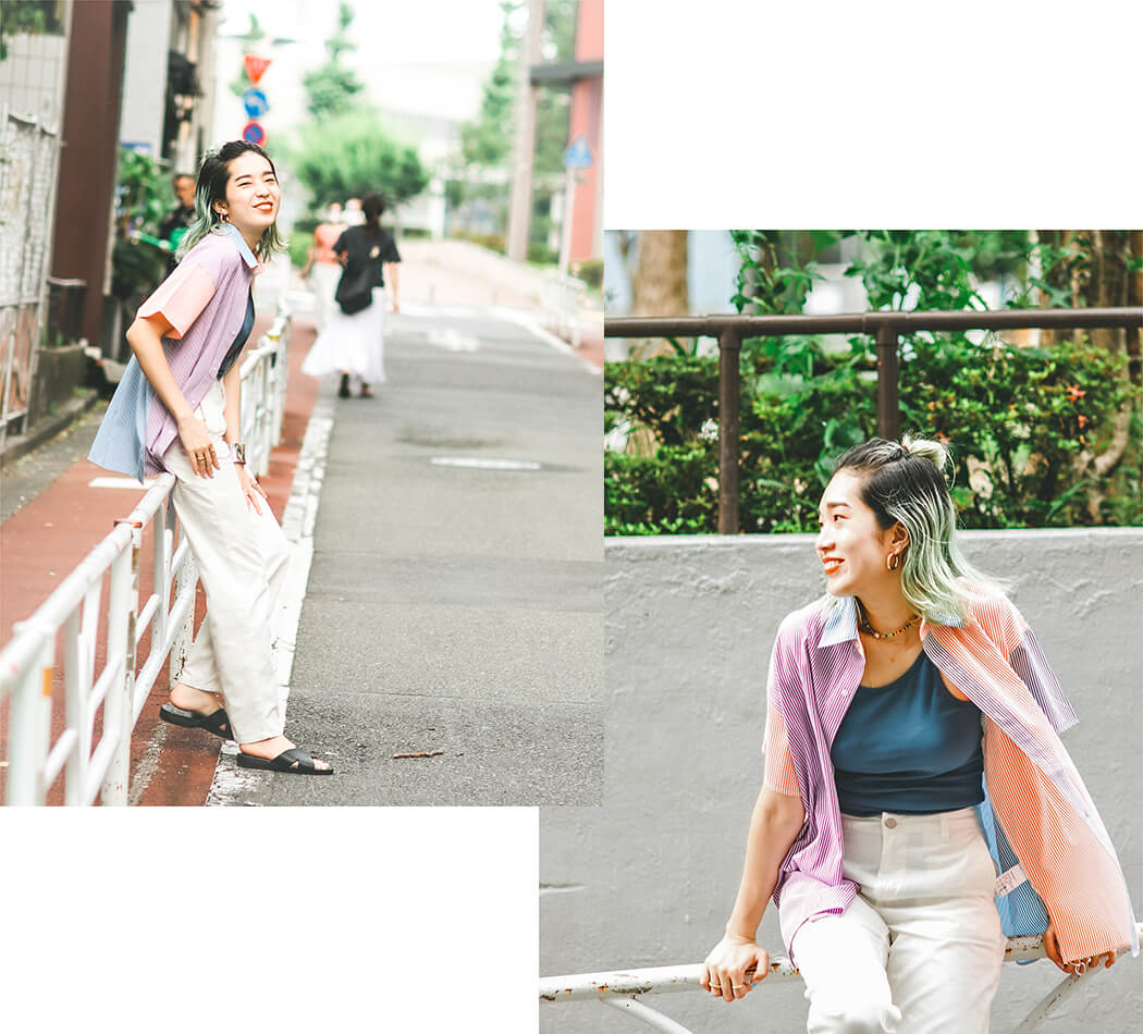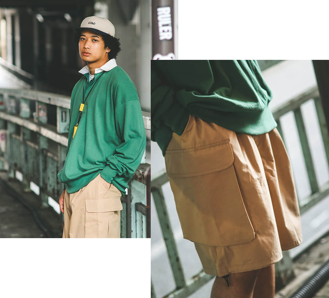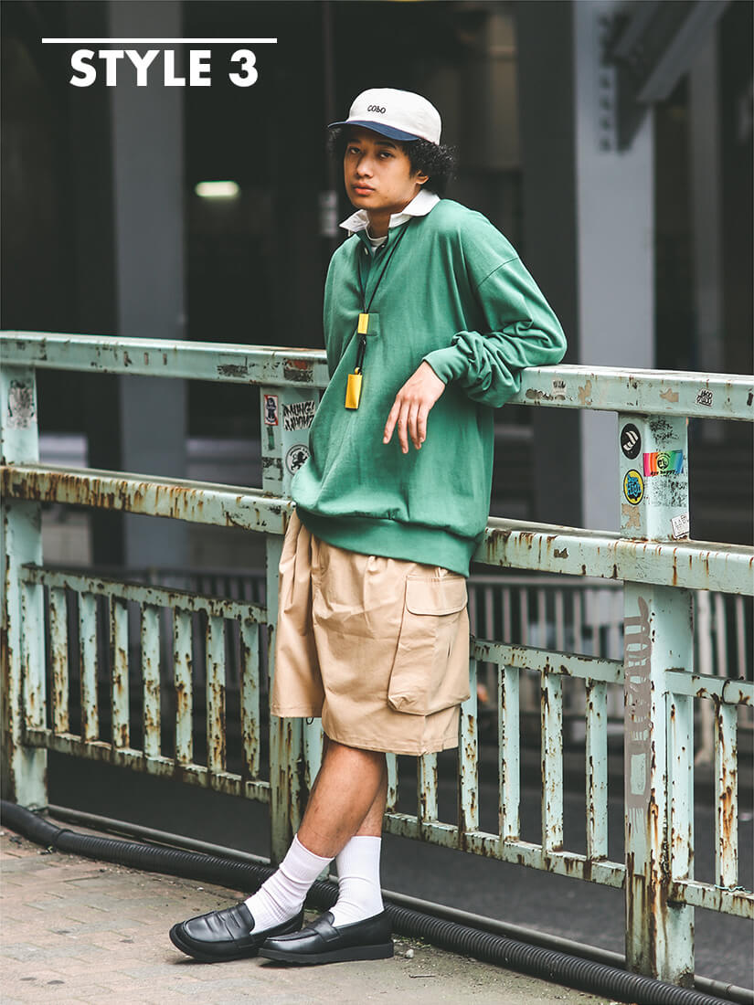 キャップやハーフパンツにあわせてシティボーイを意識しました。