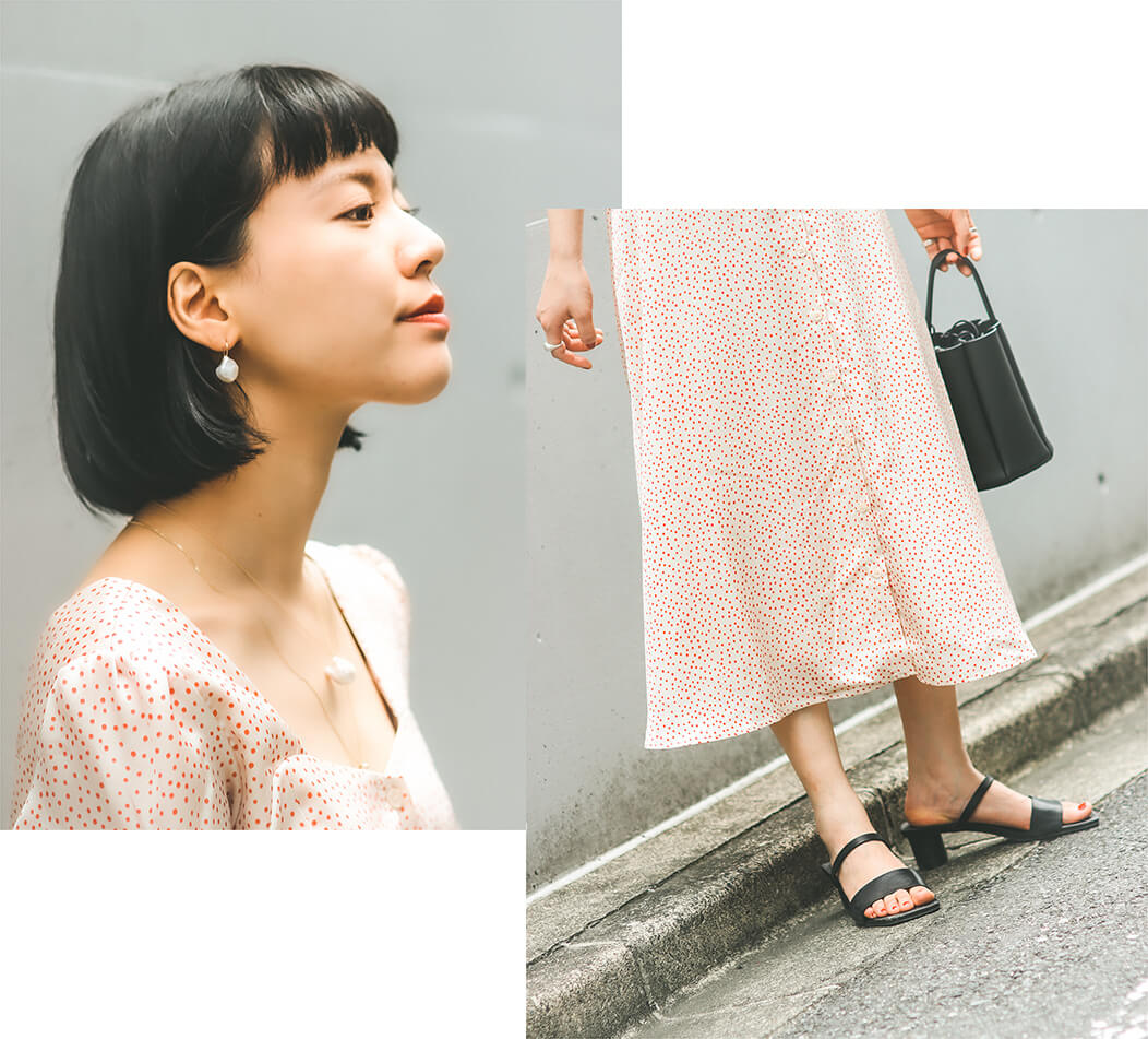 小物はブラックを選ぶことで、コーディネート全体の雰囲気が締まります。 - Oriens JOURNAL STANDARDサテン ドット OP:ワンピース¥13,750(税込)